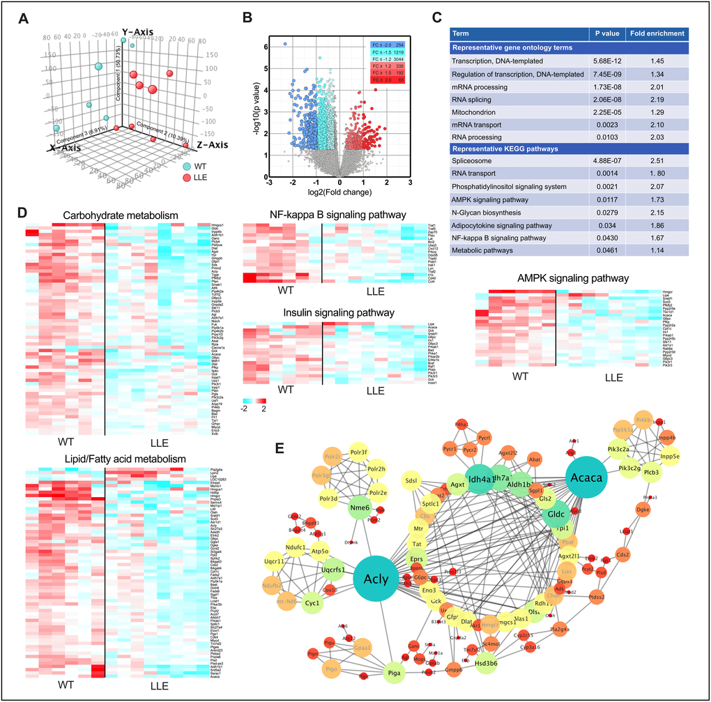 Genome-wide microarray was performed to find the changes in gene expression in the liver of the LLE mice. Principal component analysis (PCA) showed a clear shift in the global gene expression profile caused by low-dose ethanol intake when compared with the WT mice (Figure 3A). Comparison between the LLE and the WT mice identified 3766 gene species that were differentially expressed in the liver (344 genes up-regulated and 3422 genes down-regulated. Fold change≥1.2, P<0.05; Figure 3B). Further ontological and pathway analyses revealed markedly distinct patterns between groups. Narrower sets of genes in categories ‘Transcription, DNA-templated’, ‘Regulation of transcription, DNA-templated’, ‘mRNA processing’, and ‘Spliceosome’ suggest that long-term low-dose ethanol may be directly involved in gene expression regulation (Figure 3C). Considering that alcohol is widely viewed as a carcinogen, of specific interest, we analyzed the connection between the differential genes and liver cancer. Unexpectedly, the upregulated genes of LLE mice showed no correlations with gene set of liver cancer (Supplementary Figure 2A), whereas the downregulated gene set of LLE mice are highly overlapped with the gene set overexpressed in live cancer (Supplementary Figure 2B), implying that moderate ethanol intake may have anti-cancer effects. Nevertheless, further experiments are needed to determine the relationship between low-dose alcohol intake and liver cancer.