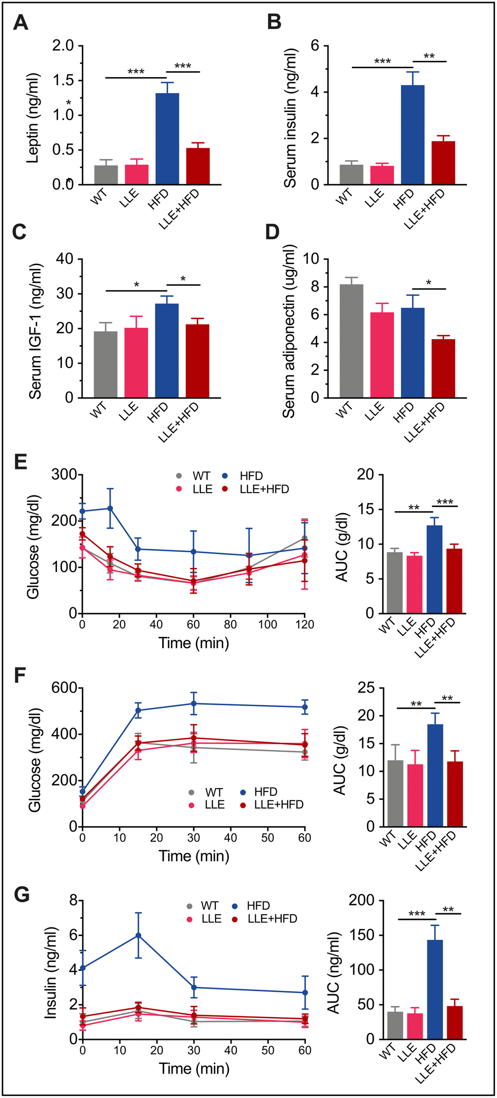 In humans, high-calorie diets cause numerous pathological conditions including obesity, cardiovascular disease, non-alcoholic fatty liver disease and diabetes. High levels of leptin in the HFD mice and increased plasma glucose, insulin and IGF-1 in the serum indicated leptin resistance and insulin resistance, suggesting the onset of diabetes (Table 1, Figure 5A–5C). In the HFD+LLE group, the levels of the same makers were significantly lower, comparable to those in the WT mice (Table 1, Figure 5A–5C), suggesting increased insulin sensitivity by ethanol. Moreover, the oral glucose tolerance test (OGTT) and insulin tolerance test (ITT) showed that the insulin sensitivity of the LLE + HFD mice was normal and considerably better than that of the HFD mice (Figure 5E–5G). These metabolic benefits of ethanol may be attributable to the activation of AMPK, a metabolic regulator that promotes insulin sensitivity and fatty acid oxidation. Surprisingly, the level of adiponectin was found to be the lowest in the LLE+HFD group (Figure 5D), against our initial expectations, considering its insulin-sensitizing properties. However, a recent report suggests that adiponectin deficiency may also rescue high fat diet-induced hepatic injury [27], leaving the role of adiponectin in this process to be further explored.