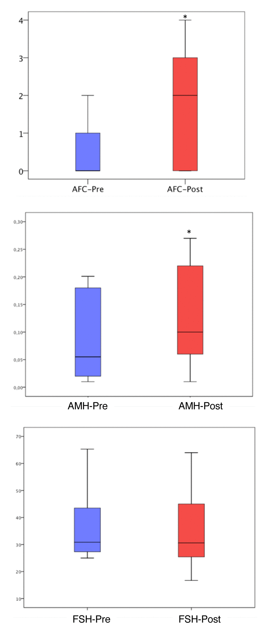 Women who were found to have at least one antral follicle (even if the number was not higher compared to pre-PRP evaluation) were started on ovarian stimulation for IVF-ICSI. In cases with an increase in AMH or decrease in FSH, but no antral follicles compared to basal measurements, stimulation was not started.