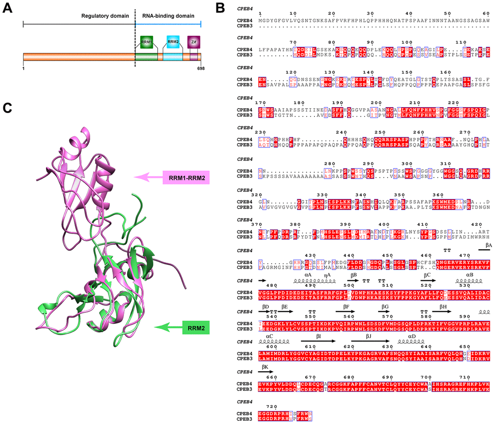 Many of these disease-related alterations occur through the interaction of RNA-binding proteins which are essential for the control of spatial-temporal plasticity-related protein (PRP) production [20–24]. Consequently, these changes impact the regulation of the transport, translation and/or stability of PRP RNA. Among translational regulators, the cytoplasmic polyadenylation element-binding protein (CPEB) family is a key RNA-binding protein family, one that plays a role in modulating the strength of glutamatergic synapses through the translational regulation of several PRP RNAs in neurons [25–30]. This RNA-binding protein family controls cytoplasmatic polyadenylation and translation of target mRNAs at synapses via a self-perpetuating, functional prion-like conformations [31, 32]. This prion-like process can shift CPEB subtypes from monomers into alternative, self-propagating conformations capable of aggregating [33–38]. In vertebrates, 4 members of the CPEB family (CPEB1 (referred to commonly in early literature as CPEB), CPEB2, CPEB3, and CPEB4) have been identified, all of which are highly expressed in the nervous system including the hippocampus, olfactory bulb, cerebellum, and peripheral afferent sensory neurons [36, 39, 40]. While all CPEBs play a role in translational regulation, CPEB1 differs in its recognition and regulatory elements. The earliest CPEB (known now as CPEB1) was discovered and characterized in Xenopus oocytes. CPEB1 achieves translation of mRNA via recognition of cytoplasmic polyadenylation elements (CPE) in target mRNA (regulated by Maskin) and subsequent binding of the cap-binding factor eIF4E (Huang et al 2006). Unlike CPEB1, CPEB2-4 differ in their regulation of target mRNA. While CPEB2-4 share RNA binding elements with CPEB1, they differ in their regulatory domains and expression patterns. Particularly, CPEB3-4 have distinct U-rich loop motifs suggesting targets unique to those subgroups (Fernandez-Miranda et al 2012). In general, all CPEBs have a carboxy terminal region composed of two RNA recognition motifs (RRMs) and two zinc finger-like motifs complemented by a highly variable N-terminal (Figure 1). Finally, there are highly conserved residues between the CPEB3 and CPEB4 protein which could hint at CPEB3’s secondary structure/function (Figure 1B), of which not much is currently known. It has been reported that the RNA binding domain of CPEB3-4 is capable of recognizing secondary structure of RNA and that the zinc finger domain is required for stable RNA binding while both the RRM1 and RRM2 are required for binding specificity (Huang et al 2006).