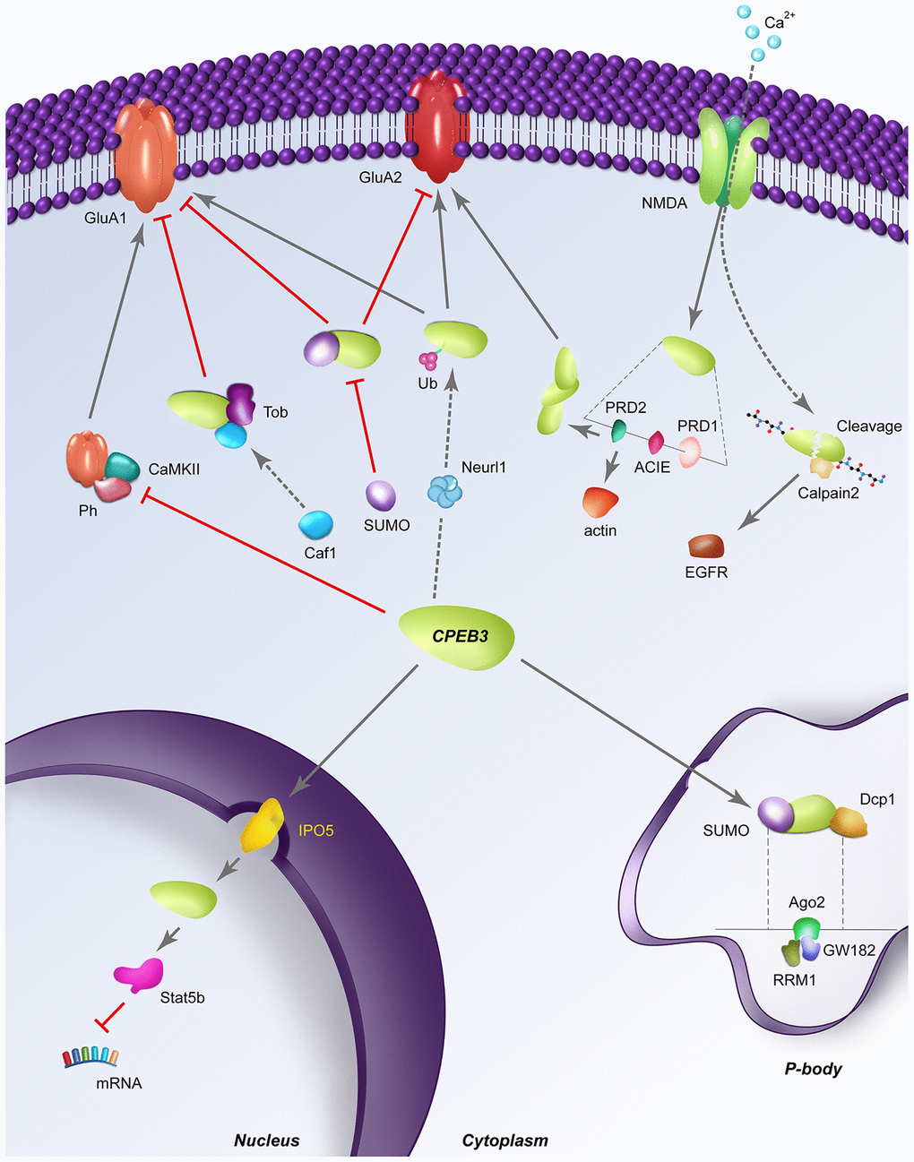 In neurons, NMDA activation promotes accumulation of CPEB3 in the nucleus. The nuclear translocation of CPEB3 is driven by the karyopherins importin 5 (IPO5) and chromosomal maintenance 1 (CRM1, also known as exportin 1) through binding of the ribonucleoside-diphosphate reductase large subunit (RRM1) domain of CPEB3. IPO5 binding is regulated by RanGTP and RanGDP. After NMDA stimulation, RanGDP is elevated in tandem with IPO5-mediated nuclear import of CPEB3 [78]. Preferential localization of nuclear CPEB3 is associated with Stat5b binding and the downregulation of Stat5b-dependent transcription. As previously mentioned, downregulation of the Stat5b target EGFR has been linked with diminished LTP, spatial learning and memory performance, indicating another mechanism by which CPEB3 influences synaptic plasticity and regulation of long term memory [26].