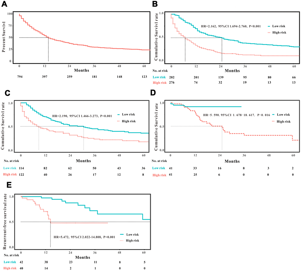 AS for recurrent-free survival (RFS), this survival nomogram was also applied to predict RFS in patients with EODGC. RFS information was absent in the SEER database, and we could only assess this indicator in the RMHWHU cohort. Twenty one (25.61%) patients with EODGC recurred after surgical resection. The performance of the survival nomogram evaluated by C-index for predicting RFS was 0.699 (95%CI= 0.562-0.835), indicating that our survival nomogram could also better predict RFS in patients with EODGC. Furthermore, all patients with EODGC in the RMHWHU cohort were divided into low-risk and high-risk groups by median survival-score, and EODGC patients in the high-risk group had worse RFS (HR=5.47, 95%CI=2.02-14.81, P<0.0001) compared to patients in low-risk group (Figure 3E).