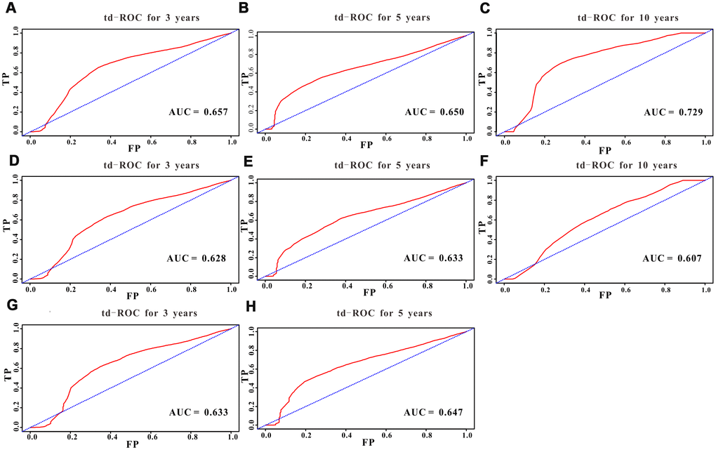The RMHWHU cohort was used as an external validation set to further verify the survival nomogram. As the longest follow-up time of EODGC patient in RMHWHU cohort was 65.1 months, so the 10-year calibration curve and td-ROC cannot be generated. The C-index of survival nomogram in the prediction of OS was 0.874 (95%CI=0.812-0.993). Specifically, ROC analysis revealed that the survival nomogram exhibited favorable predictive performance for 3-year (Figure 5G) and 5-year (Figure 5H) survival, as measured by AUC values of 0.633 and 0.647. There was a large difference (HR=5.590, HR=1.678-18.617, P=0.0016) of survival time between patients with high risk and low risk, as reflected by Kaplan-Meier plot (Figure 3D). In addition, the calibration plots for the survival rate at 3-year and 5-year points demonstrated an optimal agreement between the predicted values and actual observation values (Figure 6G–6H). As illustrated in Figure 7C, the survival nomogram was also clinically useful in the RMHWHU cohort.