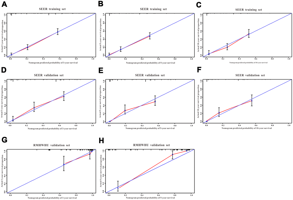 The survival nomogram was constructed with the most significant factors associated with OS using LASSO Cox regression on the training set. Next, this nomogram was internally validated with the SEER validation cohort and independently verified with the RMHWHU cohort. Log-rank test was employed to evaluate the prognostic performance of the survival nomogram, and the concordance index (C-index) was calculated to assess the predictive accuracy of the nomogram. Specifically, time-dependent receiver operating characteristic (td-ROC) curves were plotted to predict survival at 3–year, 5–year and 10–year time points. Then, calibration curves were generated for the comparison between the actual outcomes and nomogram-predicted survival outcomes. Finally, decision curve analysis (DCA) was conducted by measuring the net benefits for a group of threshold probabilities to measure clinical utility.