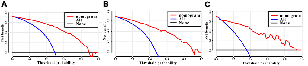 A total of 16 clinical parameters were included in the SEER training set. As LASSO regression could effectively avoid redundancy or over-fitting in the selection of significant features, we used this regression model to select the most informative factors associated with OS. Among them, five parameters (race, AJCC stage, surgery for primary site, chemotherapy and tumor size) with nonzero coefficients were finally identified using the LASSO Cox regression model (Figure 1). Hence, based on these five significant variables, a survival nomogram was created to precisely calculate the probability of survival at 3- year, 5- year and 10- year in the training set (Figure 2). C-index was exploited to assess the predictive accuracy of the survival nomogram and the value was 0.755 (95%CI=0.694-0.816). We used the median survival-score as a cut-off value to divide all patients with EODGC in the SEER training set into low-risk and high-risk groups. EODGC patients with high risk exhibited favorable OS (HR=2.162, 95%CI=1.694-2.76, P<0.0001) compared to patients with low risk, as reflected in a Kaplan-Meier plot (Figure 3B). As shown in Figure 4, patients with high risk had a shorter OS period than those with low risk across all subgroups (HR>1). Moreover, td-ROC curves were generated to further evaluate the predictive performance for 3- year (Figure 5A), 5- year (Figure 5B) and 10-year (Figure 5C) OS (AUC=0.657, 0.650 and 0.729, respectively). Additionally, the calibration curves for the probability of 3-year, 5-year and 10-year survival exhibited an optimal agreement between the predicted outcomes by the survival nomogram and actual values in the SEER training cohort (Figure 6A–6C). Then, DCA in the training set showed that if the threshold probability is over 0.5, the survival nomogram for prognostic prediction adds more benefit than treating either all or no patients (Figure 7A), indicating that our survival nomogram was clinically useful.