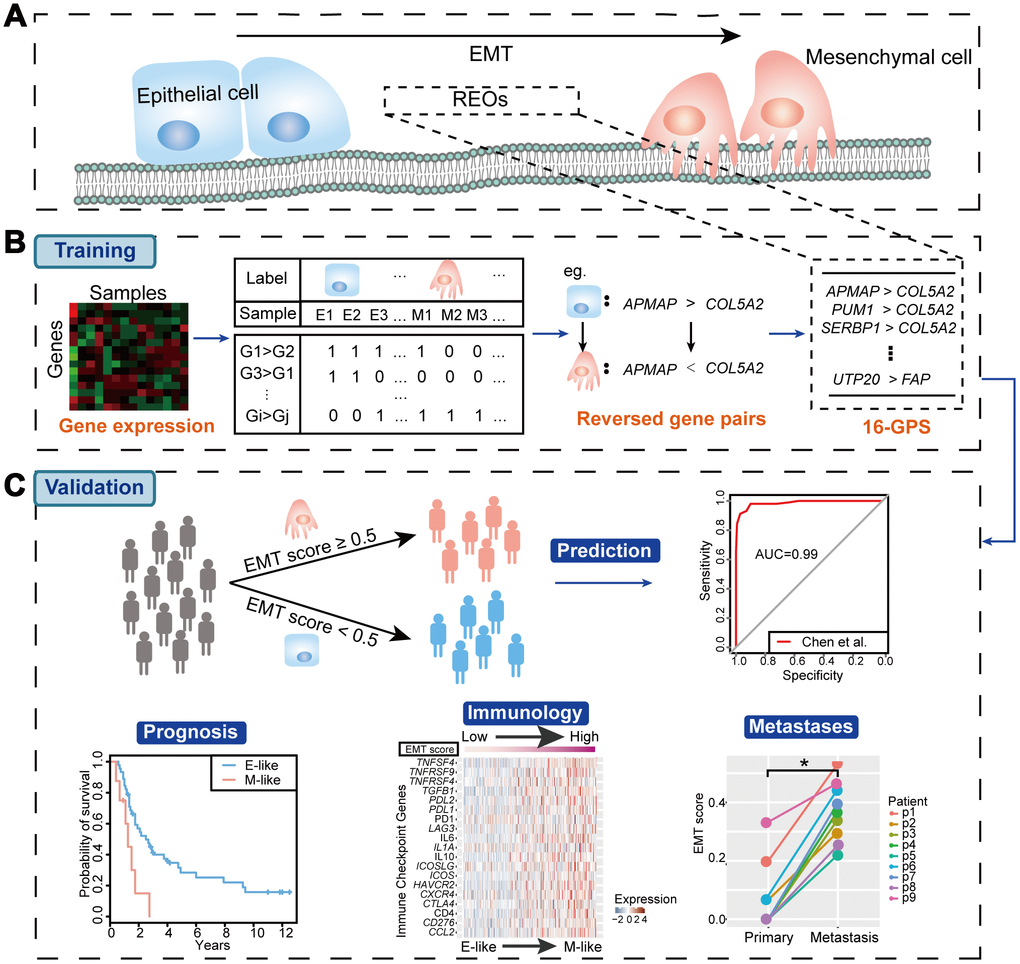 In this study, we hypothesized that a set of REOs between genes exists and is highly stable in patients with epithelial-type cancer, while showing the opposite effect in patients with mesenchymal-type cancer, enabling use of this gene set as a predictive signature for EMT status.