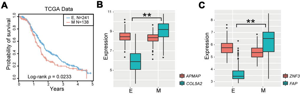 The gene pair with EMT-associated DEGs (collagen type V α 2 chain [COL5A2], fibroblast activation protein α [FAP]) is shown in Figure 2B and 2C. COL5A2 and FAP were significantly upregulated in mesenchymal OvCa samples compared with epithelial OvCa samples (P = 8.43E-63 for COL5A2 and P = 3.05E-61 for FAP, Wilcoxon rank-sum test).