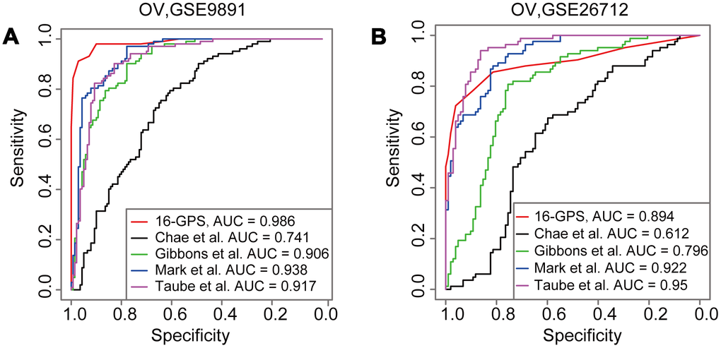 Several published EMT signatures based on the quantitative expression levels and kinetics of epithelial and mesenchymal cells have been reported (Supplementary Table 1) [1, 8, 10, 19]. The highest classification accuracy was achieved by the 16-GPS (AUC = 0.986) in the GSE9891 dataset (Figure 3A). In addition, the third highest classification accuracy was achieved by the 16-GPS (AUC = 0.894) in the GSE26712 dataset (Figure 3B). Overall, our method was superior to other methods in terms of classification accuracy and applicability in individualized diagnosis without data normalization.