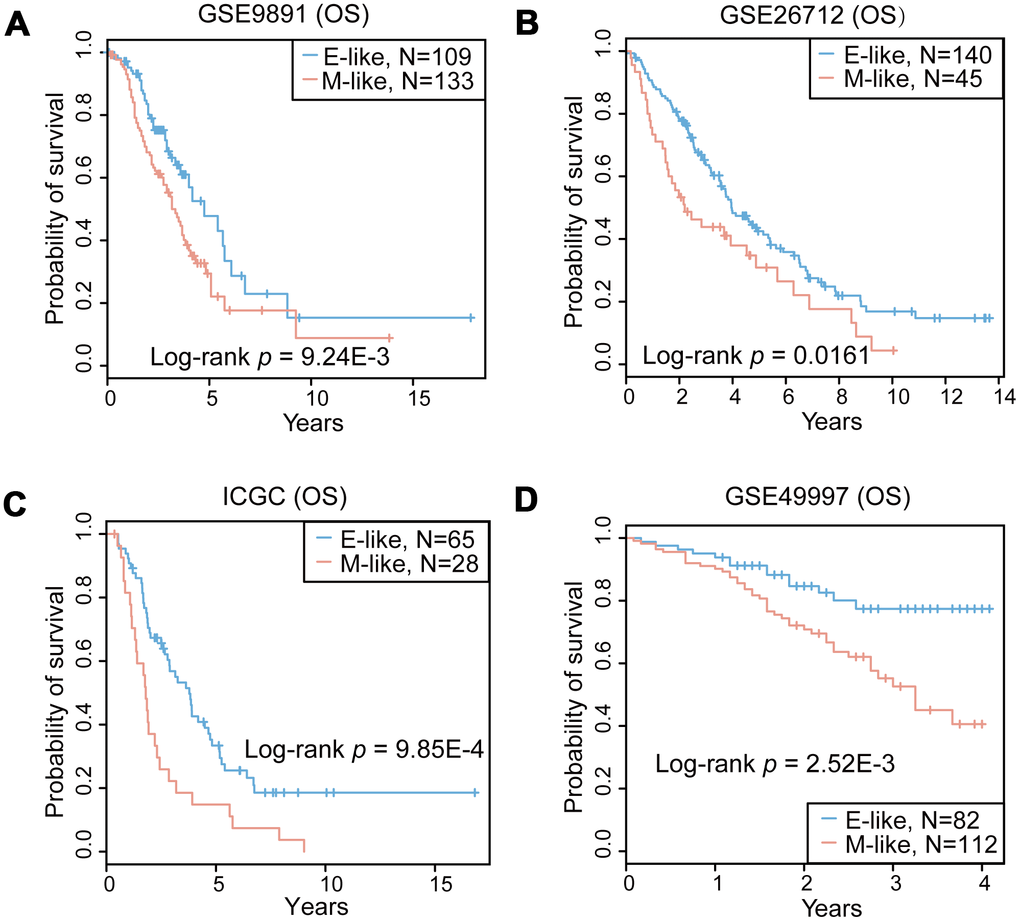 The prediction efficiency of 16-GPS was tested in four independent OvCa datasets detected by various microarray platforms from different laboratories. According to the classification guidelines described above, patients with mesenchymal-like OvCa, as classified by 16-GPS, had significantly poorer overall survival than patients with epithelial-like OvCa (P = 9.24E-3 for GSE9891 and P = 0.0161 for GSE26712, log-rank test; Figure 4A and 4B), indicating that the 16-GPS could distinguish patients who may benefit most from clinical treatment. Moreover, ROC curves suggest that the classification accuracies in the two cohorts reached 0.99 for GSE9891, and 0.89 for GSE26712 (Figure 3A and 3B). We then used the 16-GPS to stratify patients with OvCa from two cohorts without EMT labels (ICGC and GSE49997) and observed that overall survival was significantly worse in patients with mesenchymal-like OvCa than in those with epithelial-like OvCa (P = 9.85E-4 for ICGC and P = 2.52E-3 for GSE49997, log-rank test; Figure 4C and 4D).