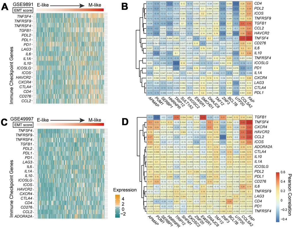 Previous studies have reported that EMT is associated with suppression of antitumor immunity and is involved in immunotherapeutic mechanisms [21]. Therefore, we performed an expression analysis to investigate the relationship between the EMT and immune-related genes. We selected 20 potentially targetable immune checkpoint genes based on clinical trials or current drug inhibitors approved by the United Stated Food and Drug Administration [1] (Supplementary Table 2). We observed a significant positive correlation between EMT scores and the expression of immune checkpoint genes in GSE9891 dataset. The expression of immune targets was enriched in mesenchymal-like samples (Figure 5A). Moreover, we also assessed correlations in expression level between genes in the 16-GPS and immune-related genes. COL5A2 and FAP were positively co-expressed with immune-related genes, including tumor necrosis factor superfamily member 4, TGFB1, C-C motif chemokine ligand 2, and hepatitis A virus cellular receptor 2 (median r = 0.43, P < 1.00E-9 for COL5A2; median r = 0.49, P < 1.00E-9 for FAP; Pearson correlation test; Figure 5B). In addition, programmed death ligand 1 (PDL1), PDL2, and cytotoxic T lymphocyte-associated protein 4 (CTLA4) showed higher expression levels in mesenchymal-like samples than in epithelial-like samples in the GSE9891 dataset (P < 0.05, Wilcoxon rank-sum test; Supplementary Figure 1A). Similar results were observed in the GSE26712 dataset (higher PDL1 and CTLA4 expression levels in mesenchymal-like samples, P < 0.05, Wilcoxon rank-sum test; Supplementary Figure 1B). In general, higher expression levels of immune-related genes were observed in mesenchymal-like samples than in epithelial-like samples. Moreover, we observed similar results in the OvCa cohort of the GSE49997 dataset (Figure 5C and 5D).