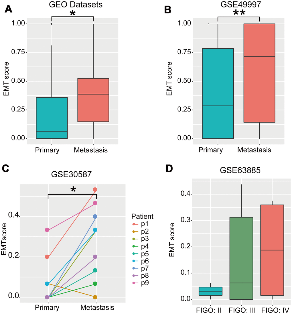 The EMT is important in promoting invasion and metastasis of cancer cells [1, 2]. A comparison of EMT scores between primary and metastatic tumors revealed that EMT scores of metastatic OvCa samples were significantly higher than those of primary OvCa samples (P < 0.05, Wilcoxon rank-sum test; Figure 6A and 6B). We further corroborated our results in a set of pair-wise samples, among which eight of nine (89%) cases exhibited significantly increased EMT scores in metastatic samples compared with those in primary samples for the same OvCa patients (P < 0.05, Wilcoxon rank-sum test; Figure 6C). Lastly, EMT scores were positively correlated with FIGO stage (Figure 6D), which is a system for histopathological diagnosis of tumor distribution, invasion, and metastasis representing the degree of cancer cell metastasis.