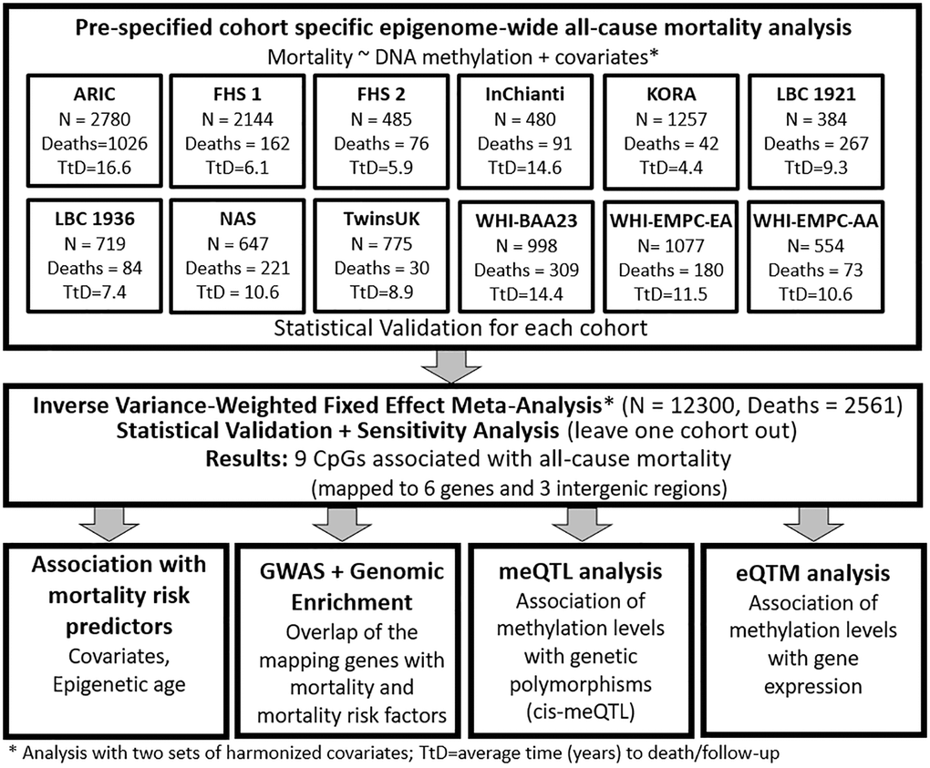 Our meta-analysis included 12,300 participants from 12 population-based cohorts of the Heart and Aging Research in Genetic Epidemiology Consortium (CHARGE; Supplementary material): Atherosclerosis Risk In Communities (ARIC), two studies from the Framingham Heart Study (FHS), Invecchiare in Chianti (InChianti), Kooperative Gesundheitsforschung in der Region Augsburg (KORA), Lothian Birth Cohort 1921 (LBC1921) and 1936 (LBC1936), Normative Aging Study (NAS), UK Adult Twin Registry (TwinsUK), and three studies from the Women’s Health Initiative (WHI), including Broad Agency Announcement 23 (WHI-BAA23) and Epigenetic Mechanisms of PM-Mediated CVD Risk (WHI-EMPC), both European (WHI-EMPC-EA) and African American ancestries (WHI-EMPC-AA). For each participant, we derived years of follow-up using time between the blood draw used for DNA methylation analysis and death or last follow-up. Each cohort excluded participants with diagnosed leukemia (ICD-9: 203–208) or undergoing chemotherapy treatment, which both modify blood-derived data [24, 25]. All participating cohorts shared cohort descriptive statistics and results files from pre-specified in-house mortality analyses (Figure 1). Further information about death ascertainment, covariates measurement and harmonization, protocols, and methods of each cohort are included in the Supplemental Materials. The institutional review committees of each cohort approved this study, and all participants provided written informed consent. Data and analytical codes that support our findings are available from the corresponding author upon request.