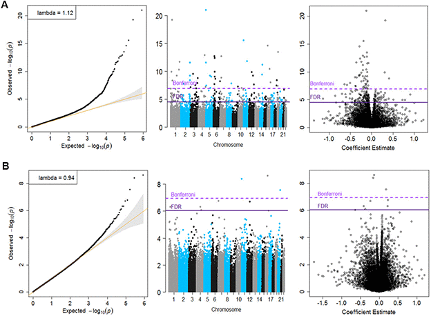 Figure 2. Quantile-Quantile plots, Manhattan and Volcano for the basic model (Panel A) and for the fully adjusted model (Panel B).