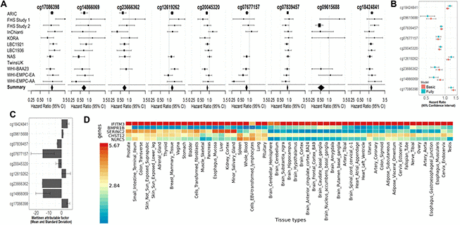 Figure 3. (A) Forest Plots for the association of methylation levels of the FDR-significant fully-adjusted CpGs with risk of all-cause mortality in the CHARGE consortium. (B) Sensitivity analysis. Comparison of the hazard ratio of the basic-adjusted and the fully-adjusted fixed effect meta-analysis. (C) Attributable factor. Predicted Contribution (%) of increased methylation levels (above the mean) of each CpG to the all-cause mortality associations in NAS, WHI-EMPC (EA) and WHI-EMPC (AA). (D) Functional Mapping and Annotation results in order to examine tissue specificity of the genes mapped to the FDR-significant fully-adjusted CpGs.