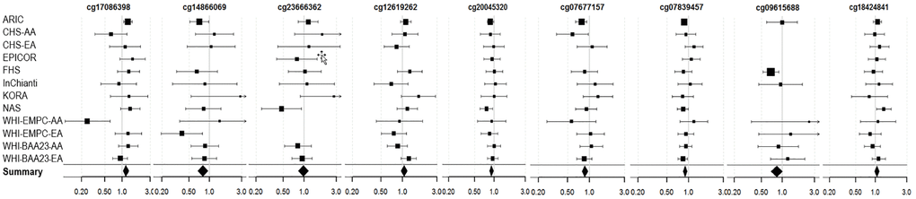 Figure 4. Forest Plots for the association of methylation levels of the FDR-significant fully-adjusted CpGs with risk of future incident coronary heart disease in the CHARGE consortium.