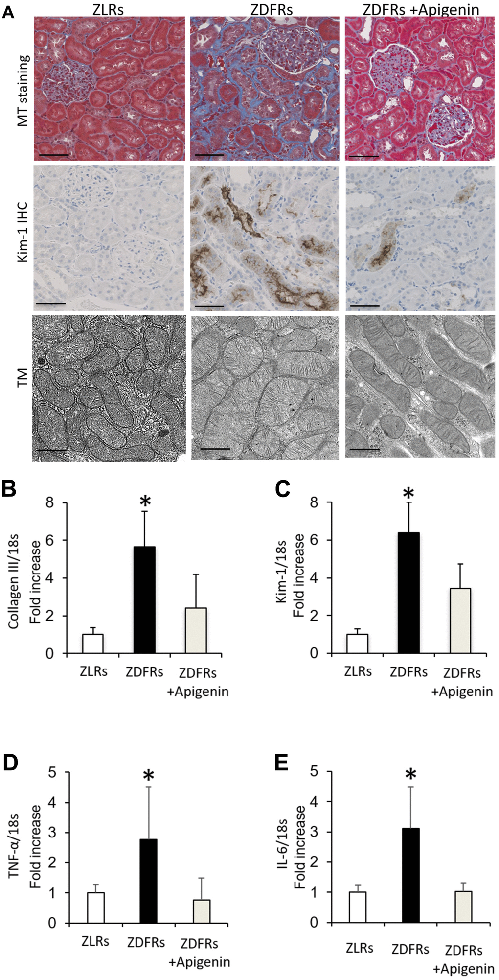 Compared to the control ZLRs group that received saline, the ZDFRs saline group exhibited renal fibrosis in the tubulointerstitial area observed by Masson’s trichrome (MT) staining, and increased protein levels of anti-kidney injury molecule-1 (Kim-1) evaluated by immunohistochemistry (IHC) (Figure 1A). The ZDFRs saline group also had an altered mitochondrial morphology, such as mitochondrial swelling, in the proximal tubular cells (Figure 1A). In addition, the ZDFRs saline group exhibited an increased gene expression in the renal cortex of collagen III and Kim-1 (Figure 1B, 1C), and of the pro-inflammatory cytokines tumor necrosis factor-α (TNF-α) and interleukin-6 (IL-6) compared to the ZLRs saline group (Figure 1D, 1E). Importantly, administration of apigenin ameliorated these alterations in the ZDFRs group (Figure 1). In contrast, apigenin had no effect on renal fibrosis and Kim-1 expression in the tubulointerstitial area in the ZLRs group; a representative photograph of MT staining and Kim-1 IHC of ZLRs treated with apigenin is shown in Supplementary Figure 1.