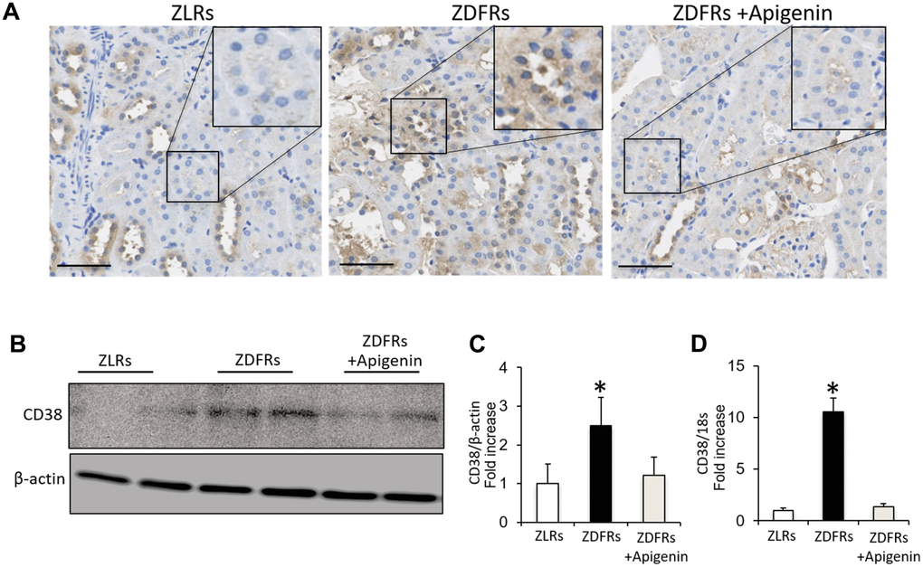 Compared to control ZLRs group that received saline, the kidneys of the ZDFRs saline group exhibited a significantly increased IHC of CD38 in tubular cells (Figure 2A), and upregulated CD38 gene and protein levels in the renal cortex (Figure 2B–2D). Administration of apigenin significantly reduced the CD38 expression in the kidneys of ZDFRs.