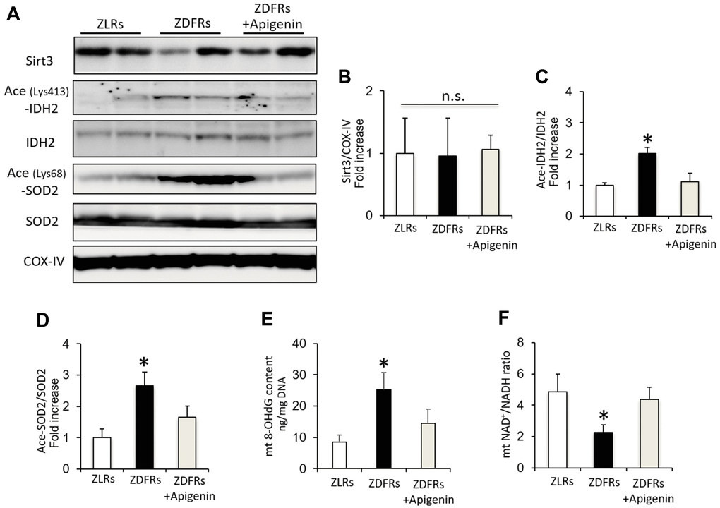 While the protein levels of Sirt3 in mitochondrial protein extracts from the renal cortex were similar among the groups (Figure 3A, 3B), the levels of acetylated IDH2 and SOD2 were significantly increased in the ZDFRs saline group compared to ZLRs saline group, indicating a reduced Sirt3 activity in diabetic rats (Figure 3A, 3C, 3D). The 8-OHdG content in mtDNA isolated from renal cortex was also significantly increased in ZDFRs administered saline compared to ZLRs treated with saline (Figure 3E). In contrast, the NAD+/NADH ratio was significantly decreased in mitochondrial protein extracts from renal cortex of the ZDFRs saline group compared to ZLRs saline group (Figure 3F). Importantly, apigenin suppressed the acetylated levels of IDH2 and SOD2, decreased the 8-OHdG content, and increased the NAD+/NADH ratio in ZDFRs (Figure 3), indicating that apigenin increases the NAD-dependent Sirt3 deacetylase activity in the kidneys of diabetic rats.