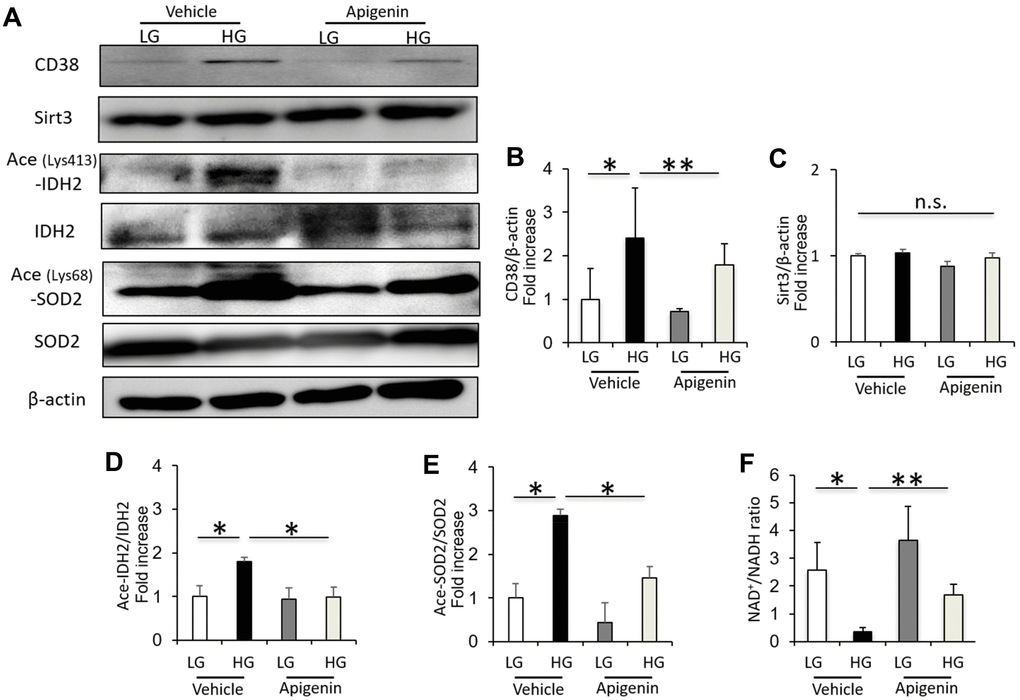 The CD38 expression and acetylated IDH2 and SOD2 levels were significantly increased in HK-2 cells cultured under high-glucose (HG) conditions compared to cells cultured in low-glucose (LG) (Figure 4A–4E). However, the Sirt3 expression in cultured HK-2 cells showed no change under LG and HG conditions (Figure 4A–4E). The intracellular NAD+/NADH ratio was significantly decreased in HK-2 cells cultured under HG conditions compared to cells cultured in LG (Figure 4F). Treatment with 10 μM apigenin significantly reduced the levels of CD38 and acetylated IDH2 and SOD2, and increased the intracellular NAD+/NADH ratio in HK-2 cells cultured under HG conditions (Figure 4), indicating that apigenin increases the Sirt3 deacetylase activity under HG conditions in vitro.