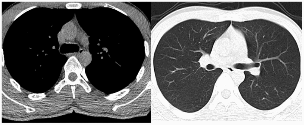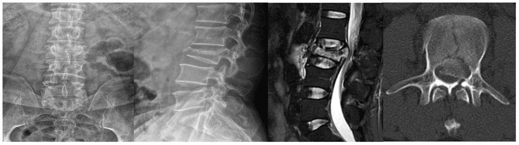 A 52-year-old male suffering with a L3 LBF presented with lower back pain and serious weakness in both lower limbs. The patient had history of shopping while wearing an ordinary mask. Physical examination indicated that his bilateral hallux dorsal extensor muscle strength level was 2, bilateral tibialis anterior muscle strength was level 2, bilateral quadriceps muscle strength was level 4, and bilateral iliopsoas muscle strength was level. X-ray, magnetic resonance imaging (MRI), and computed tomography (CT) examinations revealed an L3 LBF as well as severe spinal cord compression (Figure 1). The patient denied experiencing fever, cough, sputum production, dyspnea, nausea or vomiting. There was no significant lung abnormality on preoperative CT examination (Figure 2), and tests for viruses indicated the patient to be influenza a virus RNA (-), influenza b virus RNA (-), and respiratory syncytial virus RNA (-). Routine blood counts showed leucocytes 11.43 g/L, erythrocytes 4.87 g/L, hemoglobin 139 g/L, platelets 208 g/L, neutrophils 88.5%, lymphocytes 5.9%, monocytes 5.5%, eosinophils 0%, and basophils 0.1%.