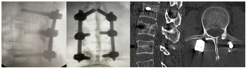 Lumbar posterior decompression and fixation was performed in a laminar flow, negative pressure operating room. All procedures were performed while strictly adhering to biosafety level 3 standards. In addition to routine personal protection, goggles were worn and postoperative disinfection was performed. The surgery took around 1 hour and 30 minutes, and there were 200 ml of blood loss without blood transfusion. After the surgery, the patient was transferred to the intensive care unit for medical observation and treatment. On the second postoperative day, the patient was safely returned back to the ward with a lumbar brace. Postoperative radiography and CT revealed that the internal repair was well positioned (Figure 3).