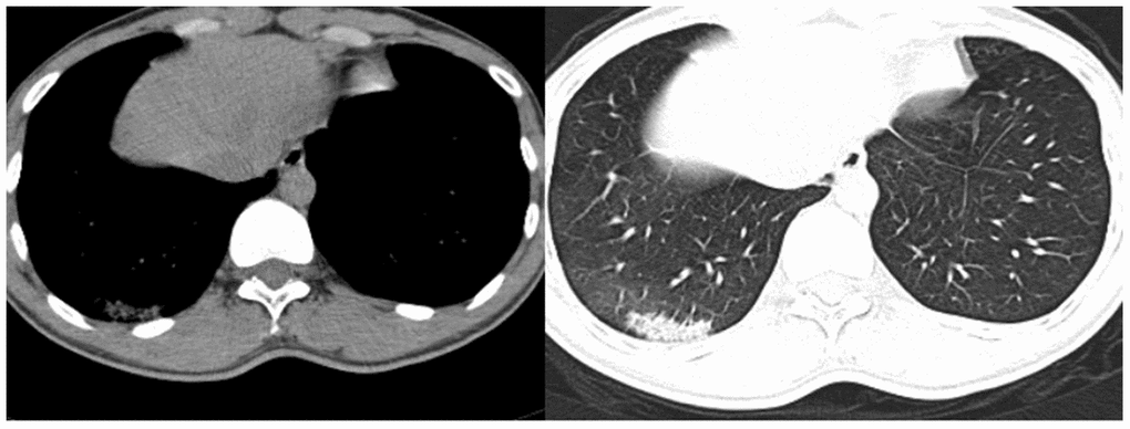 On the first postoperative day, the patient had no obvious cough or sputum production, and his vital signs were stable. By the third postoperative day, however, the patient had developed chills and a high fever, which reached 39.5°C. Routine examination showed that his leukocyte count was 7.7 g/L, hemoglobin 126 g/L, neutrophils 81.3%, lymphocytes 8.9%, monocytes 9.5%, eosinophils 0% and basophils 0.3%. Levels of procalcitonin and c-reactive protein were 0.146 ng/mL and 144.9 mg/L, respectively. A chest CT examination showed a patchy high-density shadow surrounded by a ground-glass opacity in the lower portion of the right lung (Figure 4). After consultation with specialists from the Department of Infectious Disease, the patient was immediately isolated in a single room to prevent potential widespread infection. By postoperative day 5, the patient’s temperature had decreased to 37.2°C, and his cough had significantly diminished. A nucleic acid test for SARS-CoV-2 was positive, and the patient was transferred to the Department of Infectious Disease for further treatment, which consisted of cefoperazone sulbactam 1.5 g every 12 hours, abidole hydrochloride 0.2 g orally three times a day, and oseltamivir 75 mg orally twice a day. The patient’s vital signs remained stable, and his cough and fever eventually resolved.