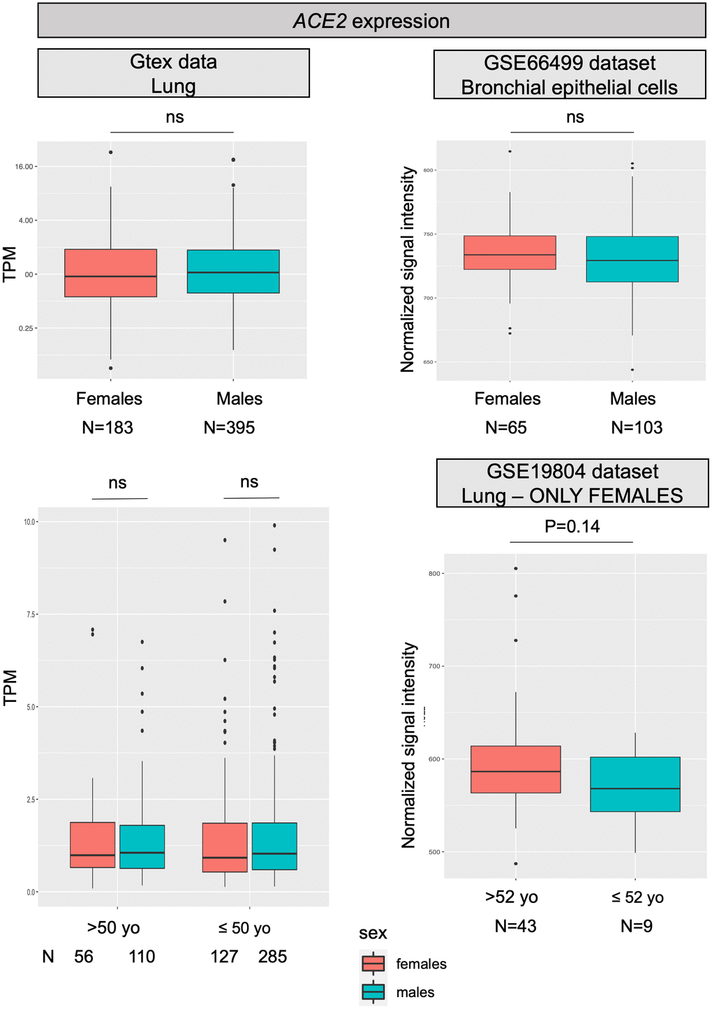 For most X-chromosome genes, the double allelic dosage in females is balanced by the epigenetic silencing of one of the X chromosomes in early development [16]. However, the X-chromosome inactivation (XCI) is incomplete in humans and up to one third of genes are expressed from both alleles, with the degree of XCI escape varying between genes and individuals [17]. ACE2 is one of the genes escaping X inactivation, but it belongs to a subgroup of X-chromosome genes escaping XCI showing an uncharacteristically heterogeneous pattern of male-female expression, with higher expression in males in several tissues [13]. Specifically concerning the lung, a recent analysis on published expression data, reported a substantial similar level of ACE2 transcript in males and females [14], however, another study, using single-cell sequencing, found a higher expression of ACE2 in Asian males [15]. Figure 1 reports data on ACE2 mRNA expression levels in the lung as retrieved from the largest datasets available in the literature; no substantial differences were found between males and females, nor between younger and older females, thus confirming what already observed by Cai and colleagues [14].