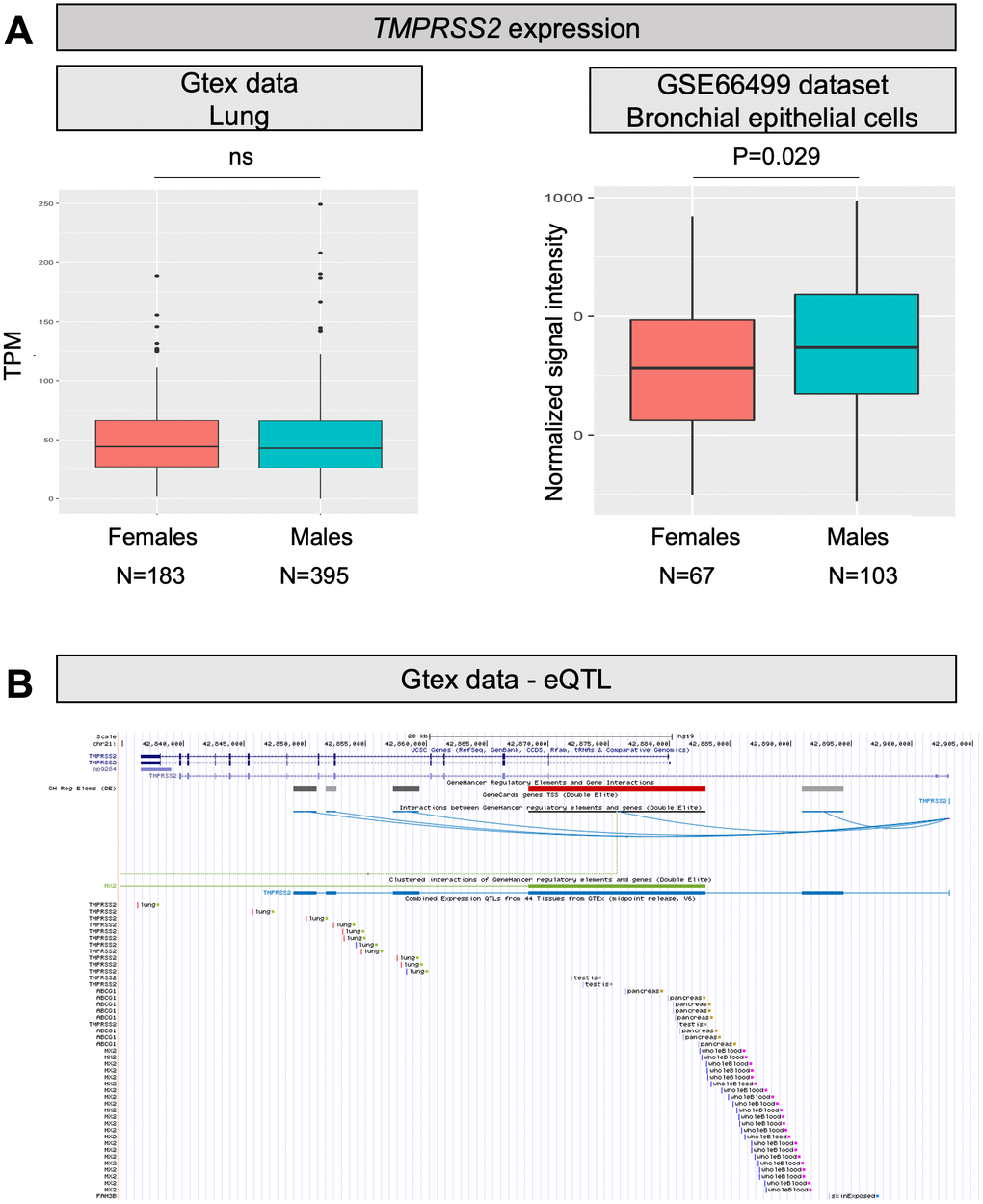 TMPRSS2 is a gene well known to oncologists as genetic rearrangements producing a fusion between TMPRSS2 and ERG (or, more rarely, other members of the ETS family) are the most frequent genetic lesions in prostate cancer patients [24]. As TMPRSS2 is an androgen responsive gene, the fusion results in androgen dependent transcription of ERG in prostate tumor cells. Therefore, we can hypothesize that males might have higher TMPRSS2 expression also in the lung, which might improve the ability of SARS-CoV-2 to enter cells by promoting membrane fusion. Looking into GTEx and GEO data, the overall expression of TMPRSS2 in the lung is only slightly increased in males (P=0.029; Figure 2A). However, TMPRSS2 expression is also promoted by estrogens [12], and therefore the situation might be different when considering individuals above 60 years, who are at higher risk of fatal events due to COVID-19, as in this group females will all be postmenopausal. According to this hypothesis, we checked the expression of the gene in lungs of males and females at different ages, but no substantial differences emerged between males and females (neither below, nor above 60 years of age; data not shown).