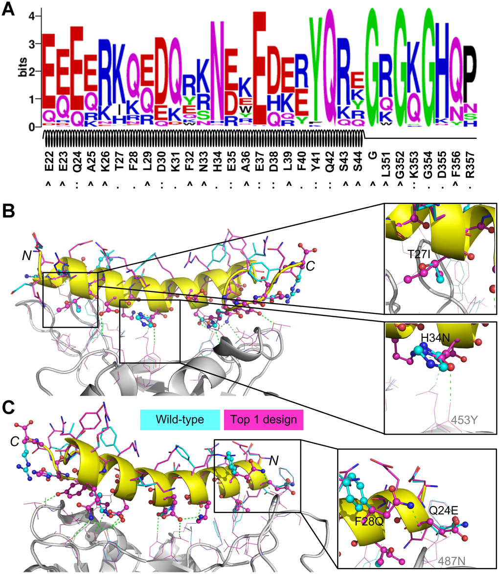 We used WebLogo [32] to perform a sequence logo analysis for the 992 designed sequences to investigate the residue substitutions and the results are shown in Figure 3A. 16 residues from the initial peptide scaffold were at the protein-peptide surface in contact with residues from SARS-CoV-2 RBD; these residues were Q24, T27, F28, D30, K31, H34, E35, E37, D38, F40, Y41, Q42, K353, G354, D355, and R357. Of these residues, Q24, D30, E35, E37, D38, Y41, Q42, and K353 formed hydrogen bonds or ion bridges with the binding partner (i.e. SARS-CoV-2 RBD) and the designed residues at these positions maintained favorable binding interactions. As shown in Figure 3A, the native residue types at these positions were top ranked out of all 20 canonical amino acids, suggesting that these residues may play critical roles in binding. For the nonpolar residues that were originally buried in the hACE2 structure (e.g. A25, L29, F32, L39, L351, and F356), they were likely to be mutated into polar or charged amino acids (Figure 3A), because they were largely exposed to the bulk solvent. The three glycine residues, including the one that was artificially introduced, were conserved, probably due to the narrow space at these positions.