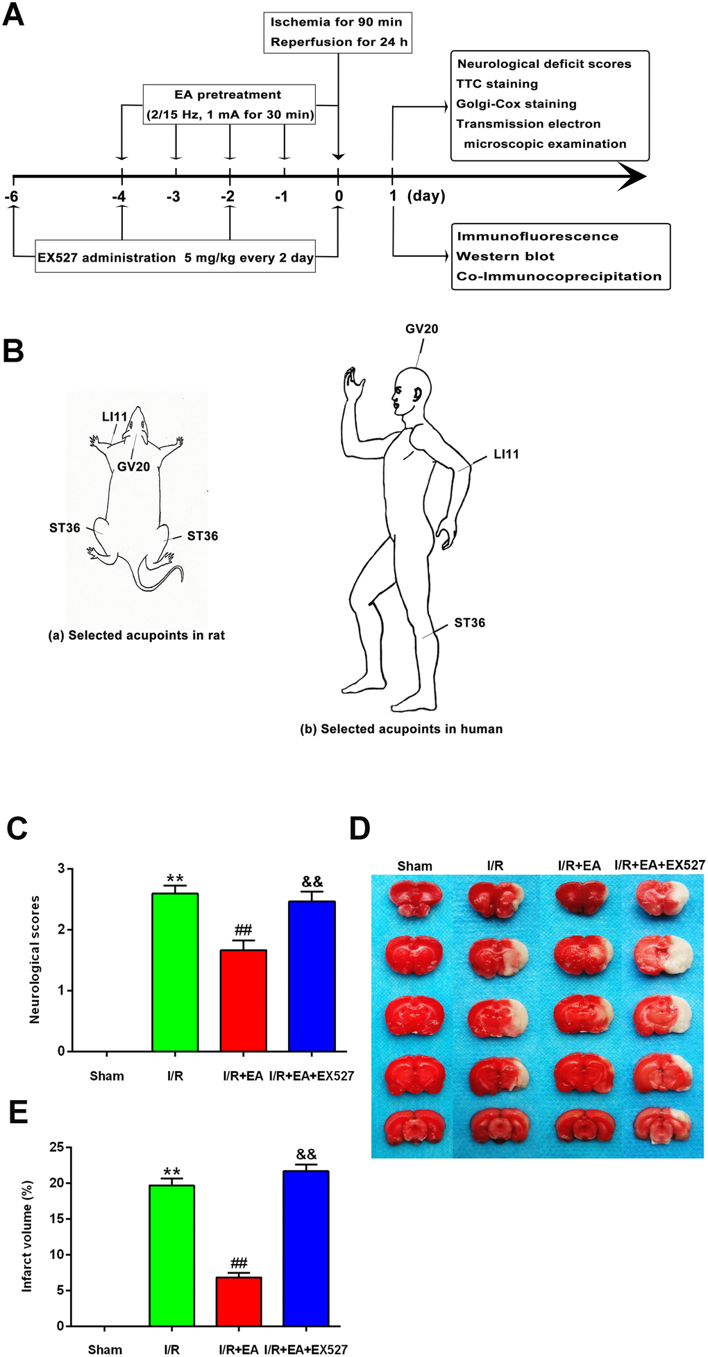 Rats in the I/R + EA group and the I/R + EA + EX527 group received EA treatment. Stainless acupuncture needles (diameter 0.35 mm and length 25 mm, Wuxi Jiajian Medical Instrument Co., Ltd, Wuxi, China) were inserted 2-3 mm deep into “Baihui” (GV20, located in the intersection of the sagittal midline and the line between the two ears), “Quchi” (LI11, located in the depression lateral to the anterior aspect of the radial proximal elbow) and “Zusanli” (ST36, located in the posterolateral side of the knee joint, approximately 5 mm below the capitula fibula) acupoints on the left limb. Animals were anesthetized and stimulated by an EA instrument (G6805-2A, Shanghai Huayi Medical Instrument Factory, Shanghai, China). The stimulation parameters were set as dense disperse waves of 2/15 Hz (adjusted to the muscle twitch threshold) and an intensity of 1 mA for 30 min/day, once per day for 5 consecutive days prior to MCAO (Figure 1A and 1B).