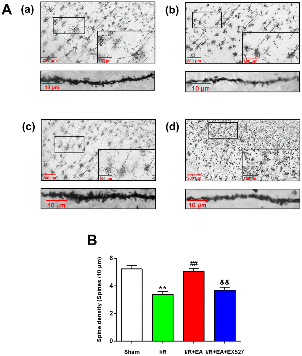 We further assessed the effect of EA on the density of dendritic spines in cortical neurons by Golgi-cox staining. The results showed that the dendritic spine density in cortical neurons was markedly decreased in rats of the I/R group compared with the sham group. The EA pretreatment at the GV20, LI11, and ST36 acupoints significantly increased dendritic spine density in cortical neurons. Nevertheless, pretreatment with EA+ EX527 blocked the increase in dendritic spine density improved by the EA pretreatment (Figure 2).