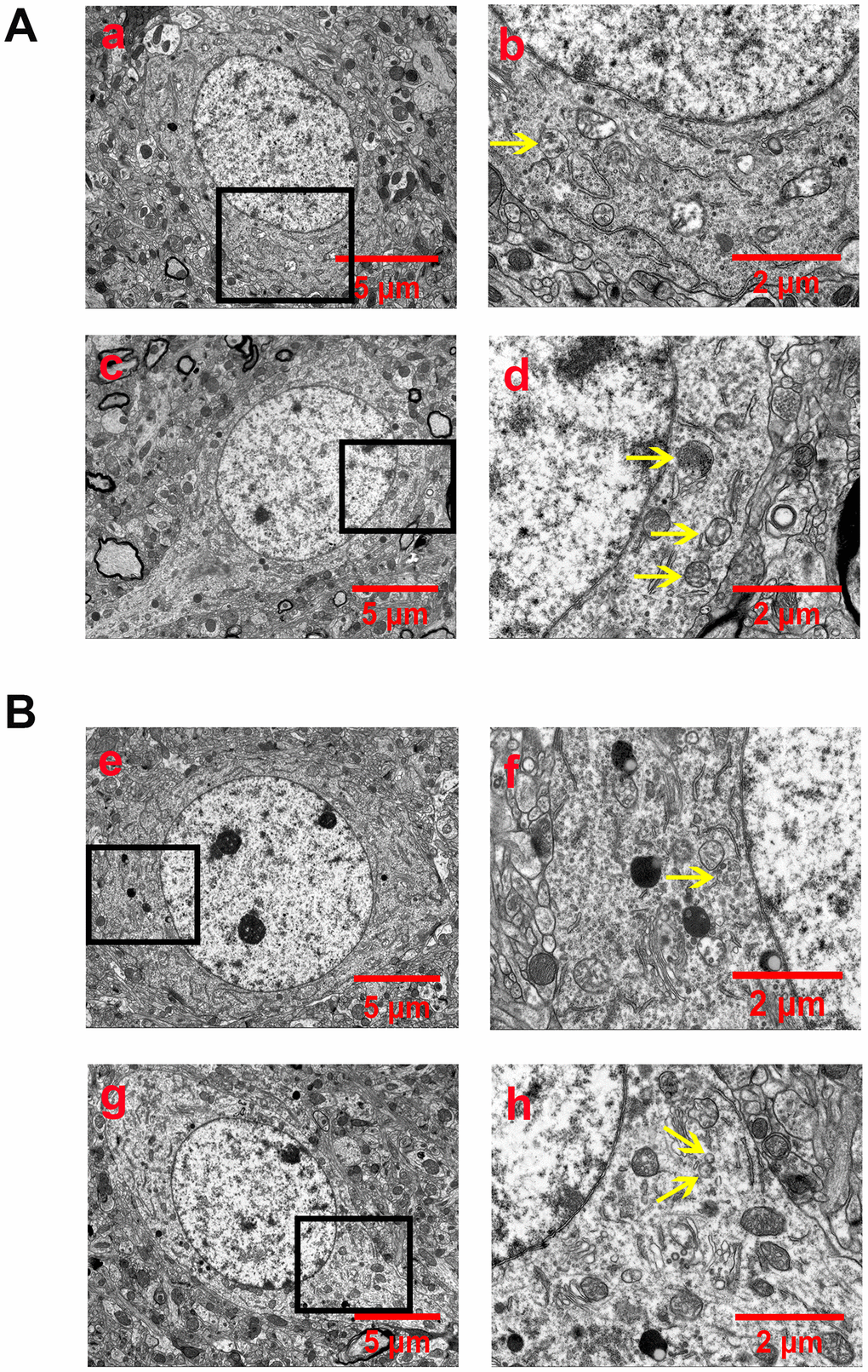 After 24 h of reperfusion, the rats were anesthetized and then perfused transcardially with a physiological saline solution followed by 0.1 M PBS containing 4% paraformaldehyde and 0.25% glutaraldehyde. The peri-ischemic cortical tissue was cut into blocks of 1 mm × 1 mm × 1 mm and post-fixed with 2.5% glutaraldehyde at 4 °C. The pieces were washed 3 times with PBS and then processed by post-fixation with 1% osmium tetroxide in PBS for 2 h at 4 °C. The tissue blocks were then washed 3 times with PBS, dehydrated in graded ethanol and then embedded in epoxy resin, which was followed by polymerization for 24 h at -80 °C. The blocks were sectioned by a Leica ultramicrotome (Leica, Wetzlar, Germany) into ultrathin sections (60-70 nm). The sections were post-stained with 3% lead citrate and visualized using a transmission electron microscope (Hitachi, Tokyo, Japan) to observe the structure and number of mitochondria, autophagosomes, autolysosomes, and lysosomes.