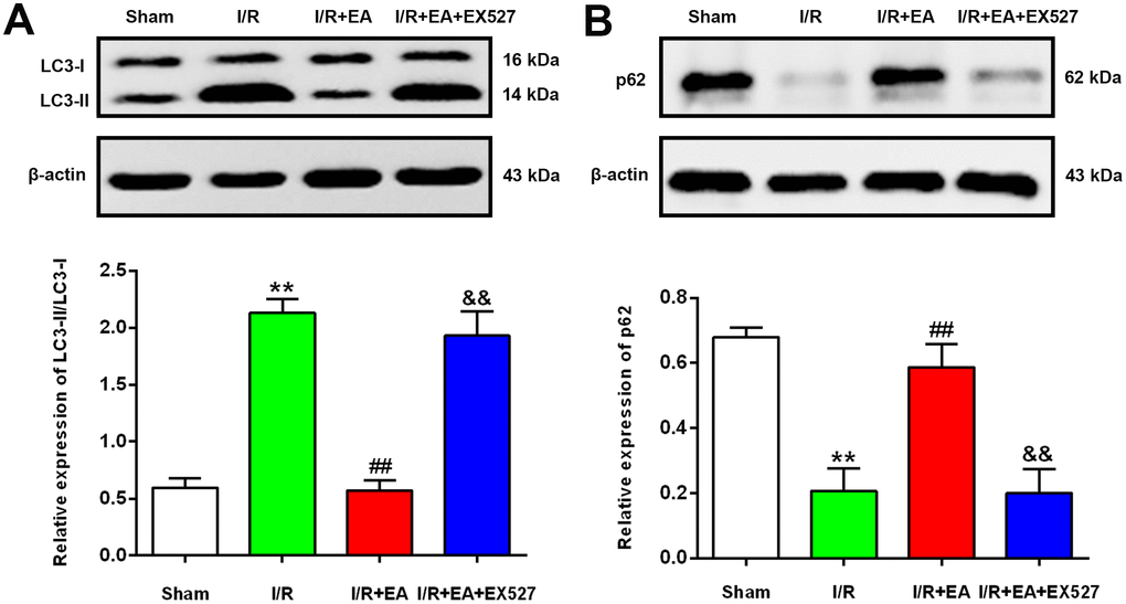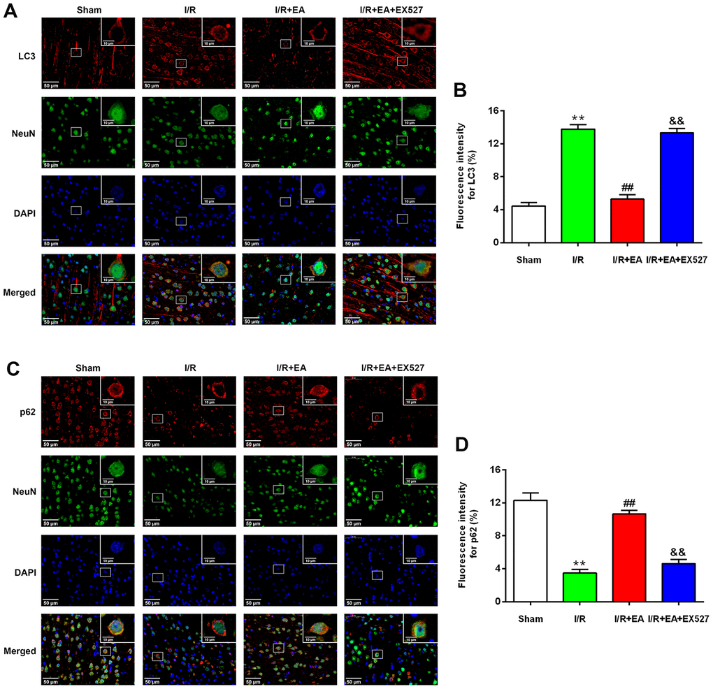 After 24 h of reperfusion, we examined the activity and location of autophagy by immunofluorescent staining. Since LC3 and p62 were both used as specific markers of autophagy, we evaluated LC3/NeuN and p62/NeuN in each group. The immunofluorescence results revealed that LC3 and p62 mainly existed in cortical neurons (Figure 4A, 4C). Compared with the sham group, the level of LC3 was dramatically increased in the I/R group while the expression of p62 was significantly decreased in cortical neurons. The EA pretreatment significantly downregulated the expression level of LC3, upregulated the expression of p62 in cortical neurons. However, pretreatment with EX527 blocked the decrease of LC3 and the increase of p62 in cortical neurons (Figure 4B, 4D).