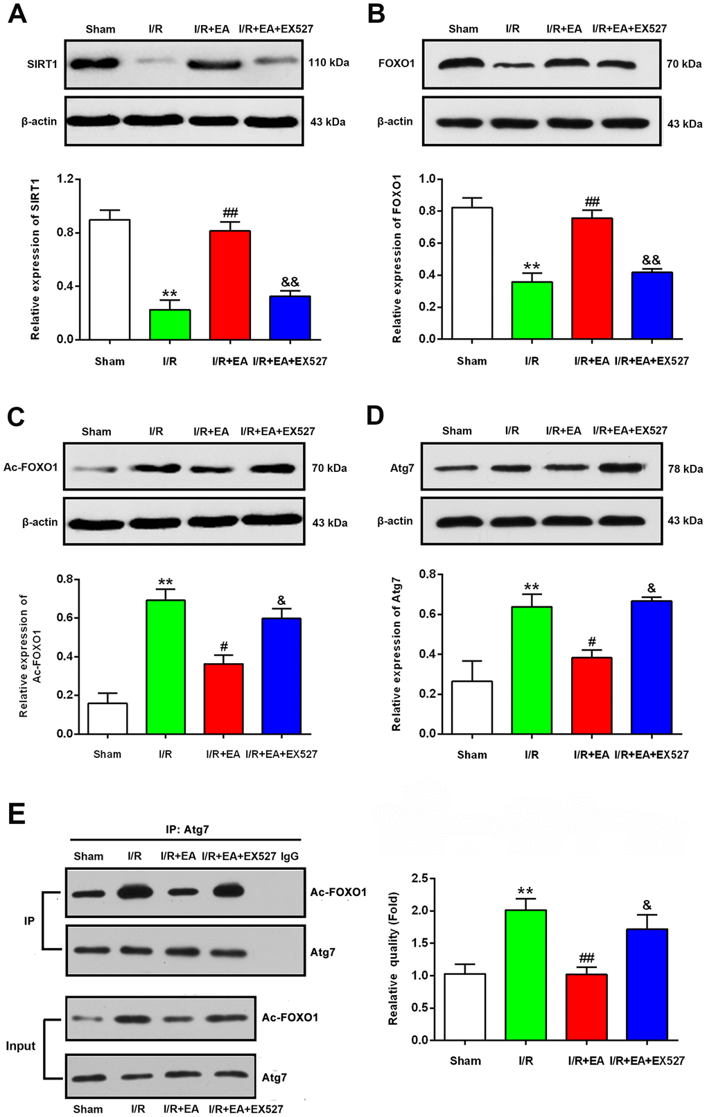 EA pretreatment increased the protein level of SIRT1, contributed to the deacetylation of FOXO1, and decreased the protein level of Atg7 after CIR injury