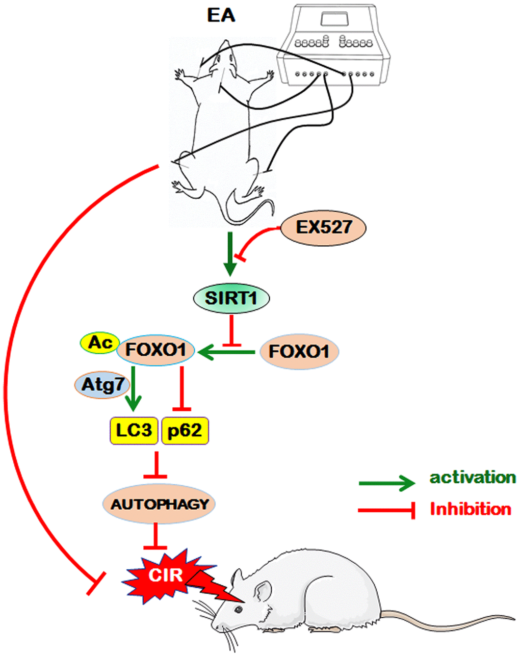 Herein, the present study investigated the mechanism involved in the beneficial effects of EA pretreatment against CIR injury. We hypothesized that EA could ameliorate CIR injury and suppress autophagy during ischemia/reperfusion by activating the SIRT1-FOXO1 signaling pathway.