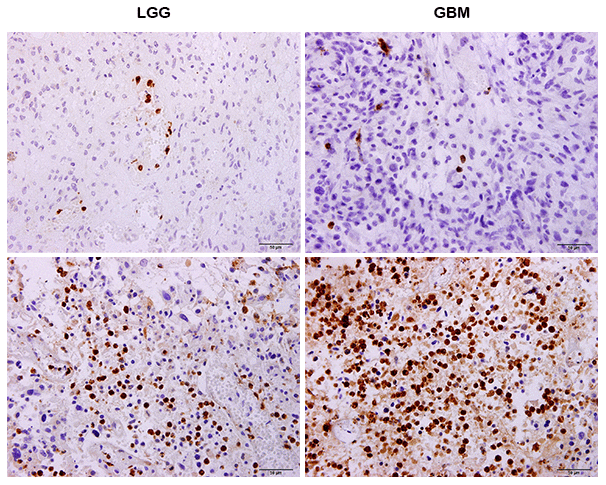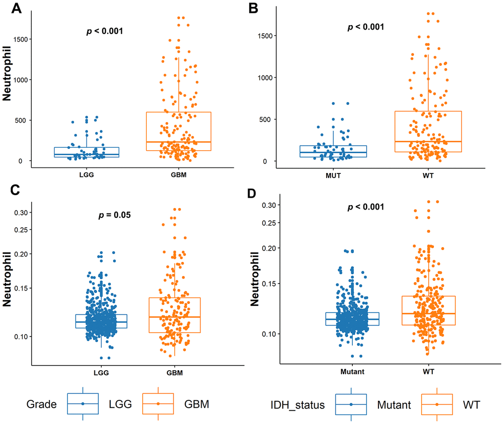 Neutrophils differentially infiltrated into glioma samples to a great extent (Figure 1). The median number of neutrophils was 183 cells/sample and this ranged from 1~1763 cells/sample. We found that TIN levels were significantly increased in GBMs compared to those in LGGs (p < 0.001, Figure 2A). Next, we compared TINs based on IDH mutation status, as this classifies gliomas based on different genetic changes and survival [15]. It was shown that TINs were dramatically decreased in gliomas samples harboring IDH-1 mutations (p < 0.001, Figure 2B). These results were all validated based on results of the TCGA cohort (Figure 2C and 2D).