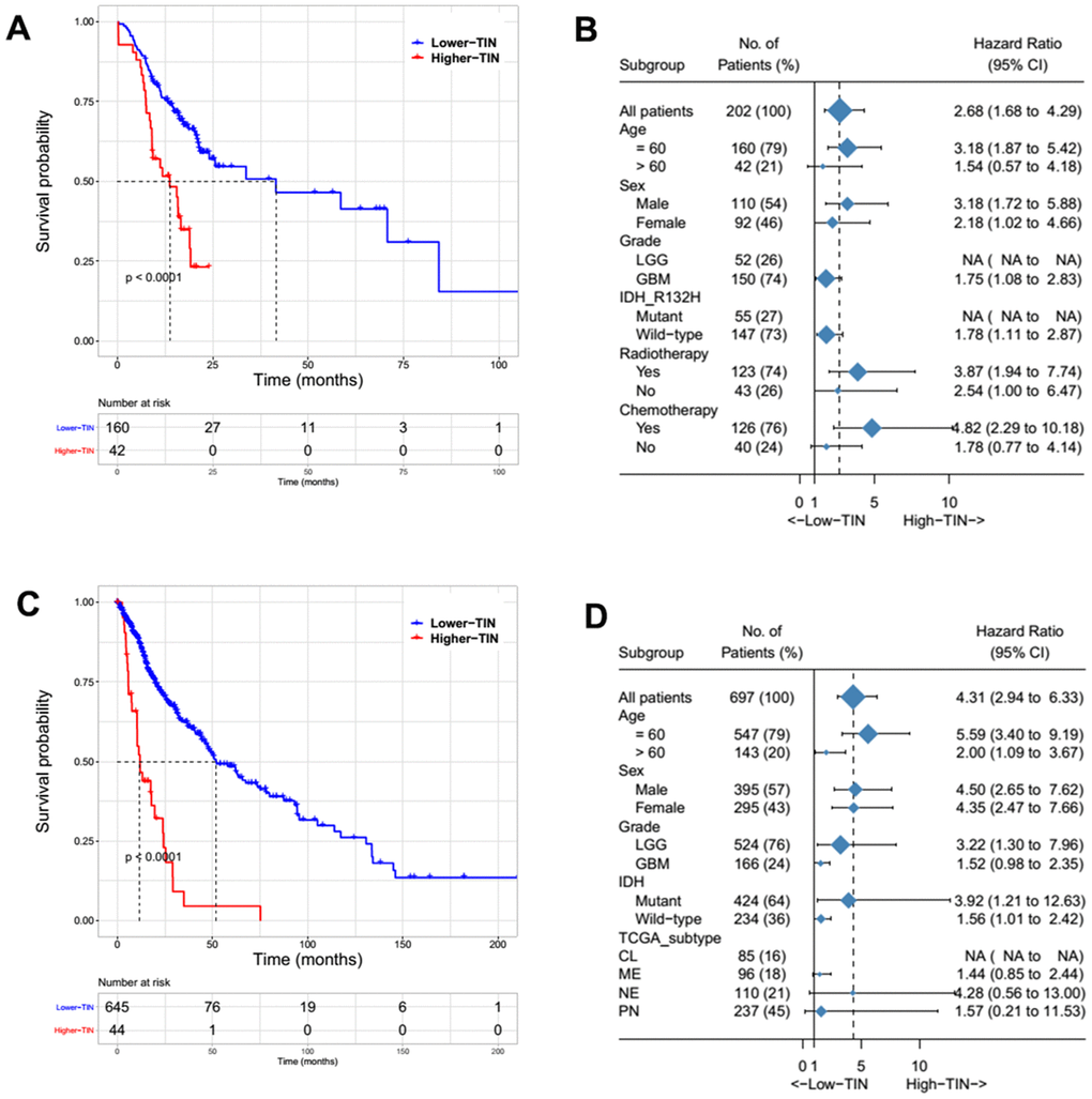 The patients were first divided into two groups according to TIN levels and the cut-off that could best predict overall survival (OS). The group with higher TIN levels was significantly associated with poor clinical outcomes both in the Sanbo cohort (p < 0.001, Figure 3A) and TCGA cohort (p < 0.001, Figure 3C). Based on subgroup analysis, TINs still predicted OS regardless of IDH mutation status and sex in both cohorts (Figure 3B, 3D). We also found that high TIN levels correlated with poor clinical outcomes in our cohort, but it did not reach statistical significance in the TCGA cohort (Figure 3B, 3D). Whereas previous studies have shown a close relationship between TINs and the mesenchymal subtype [11], this did not predict survival in the TCGA subtype (Figure 3D).
