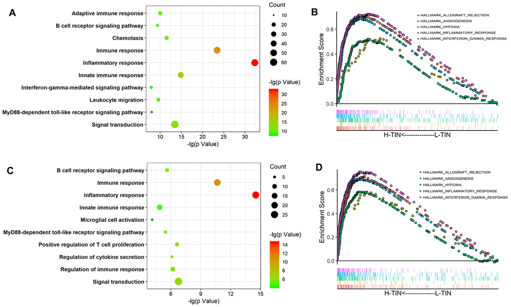 To explore the main biological processes associated with TINs in glioma, Spearman correlation analysis (|r| > 0.5 and p< 0.05) was conducted to identify related genes. In total, 373 and 141 genes were selected as being closely associated with TIN levels based on TCGA and CGGA datasets, respectively. Moreover, GO analysis was performed at the DAVID website to explore biological processes associated with TINs in gliomas. Related genes were mainly involved in immune and inflammatory responses (Figure 4A, 4C). Furthermore, gene set enrichment analysis (GSEA) analysis confirmed that TINs mainly participated in the inflammatory response, interferon-γ response, angiogenesis, and response to hypoxia in both the TCGA and CGGA datasets (Figure 4B, 4D).