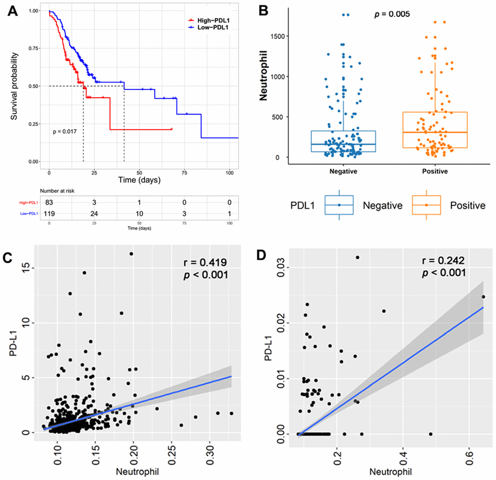 Immunohistochemistry (IHC) was performed to detect PD-L1 expression in glioma samples The representative immunohistochemical images for PD-L1 are shown in Supplementary Figure 1. This showed that tumors with higher PD-L1 expression were associated with poor clinical outcomes (p = 0.017, Figure 5A). Moreover, TINs were significantly increased in PD-L1-positive tumors (p = 0.005, Figure 5B). Next, we performed Spearman correlation analysis, comparing TINs with PD-L1 mRNA levels. This showed that PD-L1 transcript levels were significantly and positively associated with TINs in TCGA (Figure 5C) and CGGA cohorts (Figure 5D).