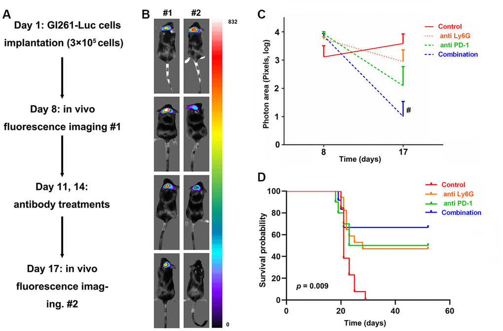 A flow diagram of this experiment is presented in Figure 6A. Briefly, the intracranial xenograft mouse model was generated on day 1 and fluorescence imaging was performed on day 8 to exclude mice that failed to develop gliomas. Finally, 52 mice were included in our study and were randomly divided into four groups as follows: control (n = 13), anti-PD-1 antibody (n = 10), anti-Ly6G (n = 17), combined therapy (n = 12). On the 11th and 14th days, each group received antibody treatments. On day 17, fluorescence imaging was performed to evaluate changes in tumor size.