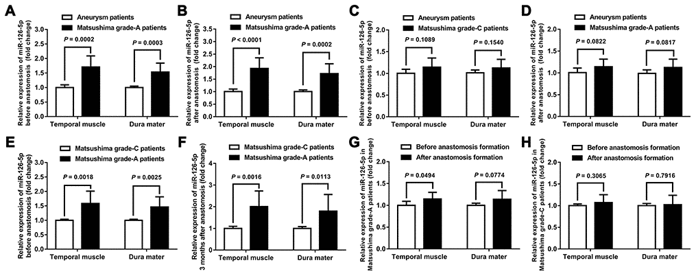 The results showed that the expression of miR-126-5p in TM and DM tissues was significantly higher in moyamoya patients with Matsushima grade-A revascularization than in both aneurysm patients (the control group) and the patients with Matsushima grade-C anastomosis, and this finding was obtained both before and after anastomosis formation. In addition, for the Matsushima grade-A patients, the expression of miR-126-5p in contralateral TM tissue harvested 3 months after the first revascularization surgery (after anastomosis formation) was also significantly higher than that observed in TM tissue harvested during the first surgery (1.145 ± 0.154 vs. 1.008 ± 0.094, P = 0.0494) (Figure 1).