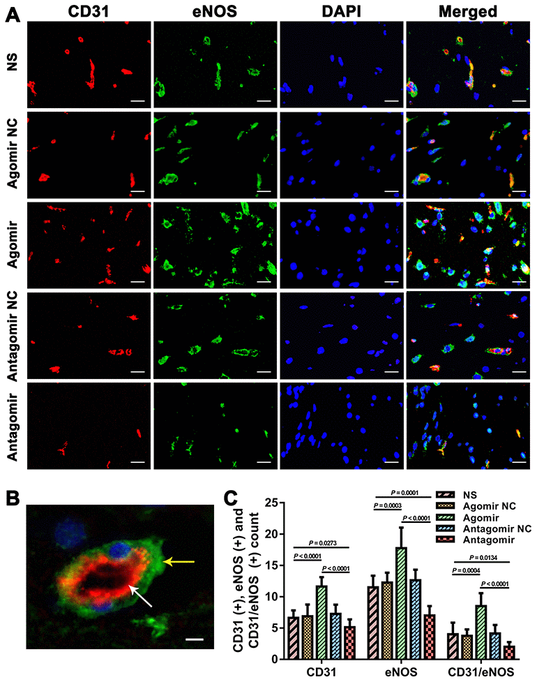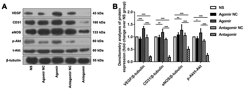 We subsequently performed immunofluorescence and western blot assays to compare the expression of VEGF, CD31, eNOS and p-Akt. The results showed that the expression of VEGF and CD31 in TM tissues from the agomir group was significantly higher than that detected in TM tissues from the NS and antagomir groups (Figure 7). Furthermore, the expression of VEGF, CD31, eNOS and p-Akt in the cerebral cortex of rats belonging to the agomir group was significantly higher than that detected in the cerebral cortex of rats belonging to the NS and antagomir groups; in contrast, the expression of VEGF, CD31, eNOS and p-Akt was significantly lower in the antagomir group than in all the other control groups (Figures 8–10).