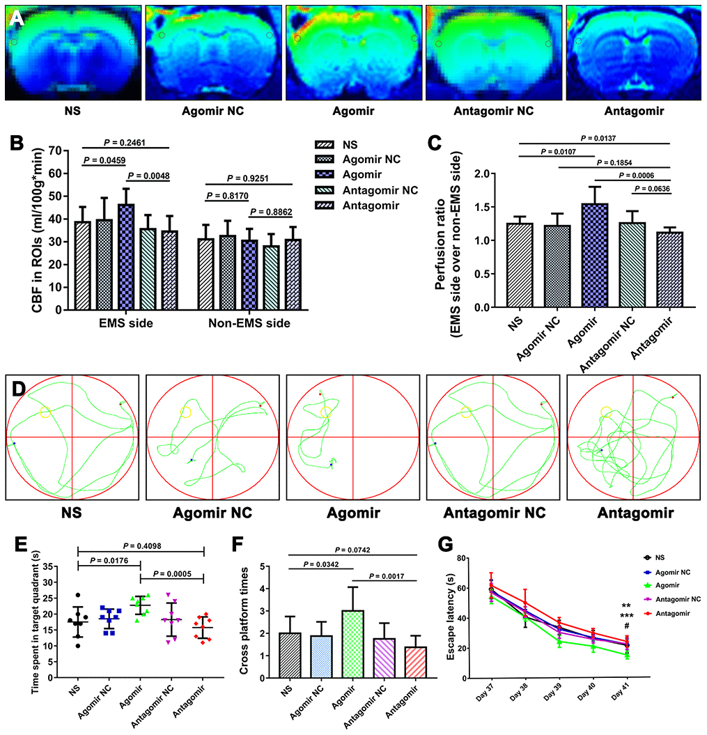 We used the CBP values and perfusion ratios in the magnetic resonance imaging arterial spin labeling (MRI-ASL) sequences to compare the improvement in CBP among the various groups. The CBP values of the ROI on the EMS side obtained for the agomir group were significantly higher than those found for the NS and antagomir groups (46.15 ± 7.12 vs. 38.58 ± 6.70 ml/100 g·min, P = 0.0459; 46.15 ± 7.12 vs. 34.48 ± 6.84 ml/100 g·min, P = 0.0048). However, the CBP values of the ROIs on the EMS side obtained for the antagomir group were not significantly lower than those obtained for the NS group (34.48 ± 6.84 vs. 38.58 ± 6.70 ml/100 g·min, P = 0.2461). In addition, the perfusion ratio of the agomir group was 1.541 ± 0.260, which was significantly higher than that of the NS (1.248 ± 0.107, P = 0.0107) and antagomir (1.116 ± 0.079, P = 0.0006) groups. Furthermore, the perfusion ratio of the antagomir group was significantly lower than that of the NS group (1.116 ± 0.079 vs. 1.248 ± 0.107, P = 0.0137) (Figure 11A–11C).
