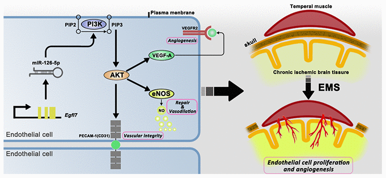 After establishing a 2VO+EMS rat model, we showed that increasing the expression of miR-126-5p in TM tissue can promote EC proliferation and angiogenesis in adjacent chronically ischemic brain tissue. This process not only improves regional CBP in rats but also promotes the recovery of cognitive function. The role of miRNA-126-5p in promoting EC proliferation is attributed to the increase in the expression of VEGF, CD31 and eNOS mediated through the PI3K/Akt pathway.