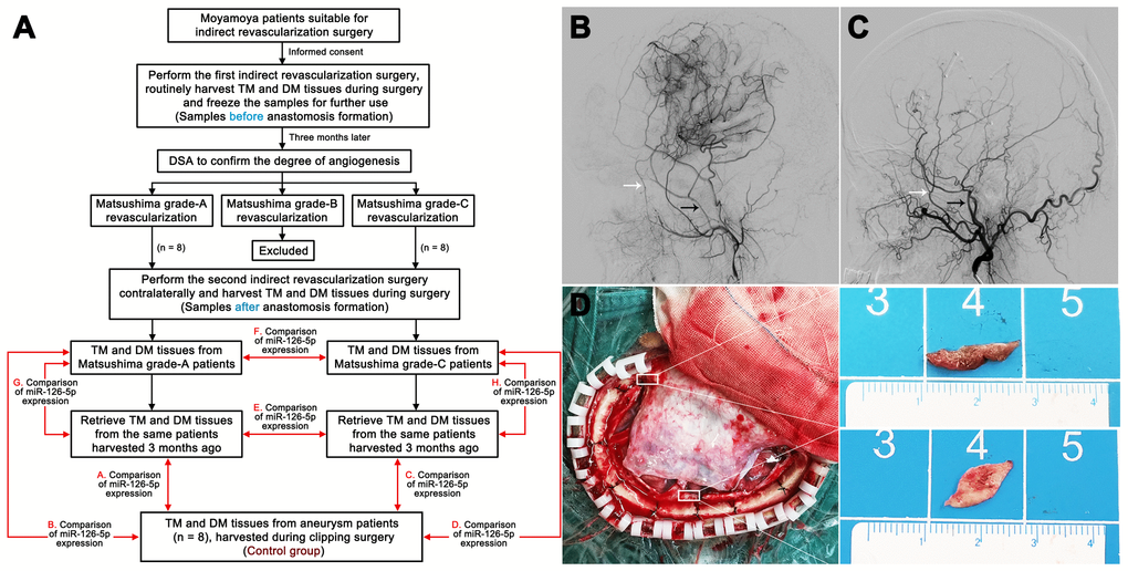 We initially explored the relationship between the expression of miR-126-5p and the degree of angiogenesis after indirect revascularization surgery by detecting the expression of miR-126-5p in TM and DM tissues from moyamoya patients (Table 1). During the combined EMS and dura inversion procedure for moyamoya patients, samples of the TM (1.0 × 0.5 cm) and DM (1.0 × 1.0 cm) were collected and stored routinely for further use (pre-anastomosis formation samples). All fresh samples were used for qRT-PCR, frozen in liquid nitrogen and stored at -80°C. Three months after the initial revascularization surgery, we routinely performed digital subtraction angiography (DSA) examinations to detect the formation of extracranial-to-intracranial (EC-IC) anastomosis based on Matsushima classification scores: grade-A revascularization indicated that more than two-thirds of the middle cerebral artery (MCA) anastomosis-induced circulation was fulfilled, grade-B revascularization indicated one-third to two-thirds fulfillment, and grade-C revascularization indicated less than one-third fulfillment [29]. We then harvested TM and DM samples from patients with grade-A revascularization (n = 8) and grade-C revascularization (n = 8) during contralateral indirect revascularization surgery (post-anastomosis formation samples) and compared their miR-126-5p expression levels (Figure 13). The TM and DM samples were also harvested from the aneurysm patients (n = 8) during clipping procedurals, and the miR-126-5p expression of these samples was used as the control. The study was carried out in accordance with the Declaration of Helsinki (2000) and was approved by the Ethics Committee of the Third Affiliated Hospital of Sun Yat-sen University. Written informed consent was obtained from all the participants.