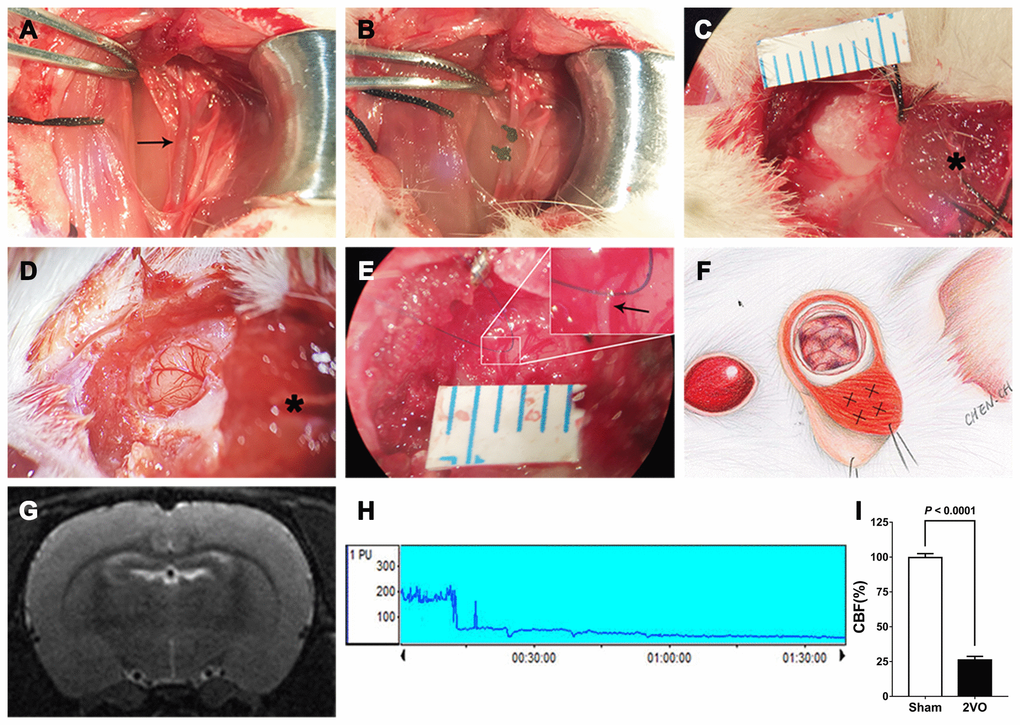 A CCI model was established by performing 2VO. Each rat was anesthetized with 10% chloral hydrate, fixed on a stereotaxic instrument and placed on a heating pad, and its temperature was monitored and maintained at 37°C. The right common carotid artery (CCA) was exposed by a straight incision in the middle of the neck, and the incision was closed after ligation of the right CCA with two 3-0 silk threads. After 7 days, a scalp incision was made along the midline, a burr hole was made with an electric drill in the right frontal region (0.8 mm posterior and 3.4 mm lateral to the bregma), and a placement device fixed with cyanoacrylate adhesives for the contact probe was set. Subsequently, the left CCA was exposed using the same method. The left CCA was temporarily clamped with an artery clip for 5 min, and the clip was then released to restore the blood flow. After 5 min, the left CCA was clamped again for 10 min, and 10 min later, the left CCA was ligated with two 3-0 silk threads. The 2VO sham group was subjected to the same procedure but without common carotid artery ligation. The cerebral blood flow (CBF) before and after 2VO was measured by laser Doppler flowmetry. The mean CBF values are expressed as percentages of the baseline value. Successful 2VO model establishment was confirmed by 1) a decline in CBF to approximately 30% of the baseline before surgery and 2) lack of a large area of cerebral infarction on the brain MRI-T2 sequence 1 day after the 2VO procedure (Figure 15).