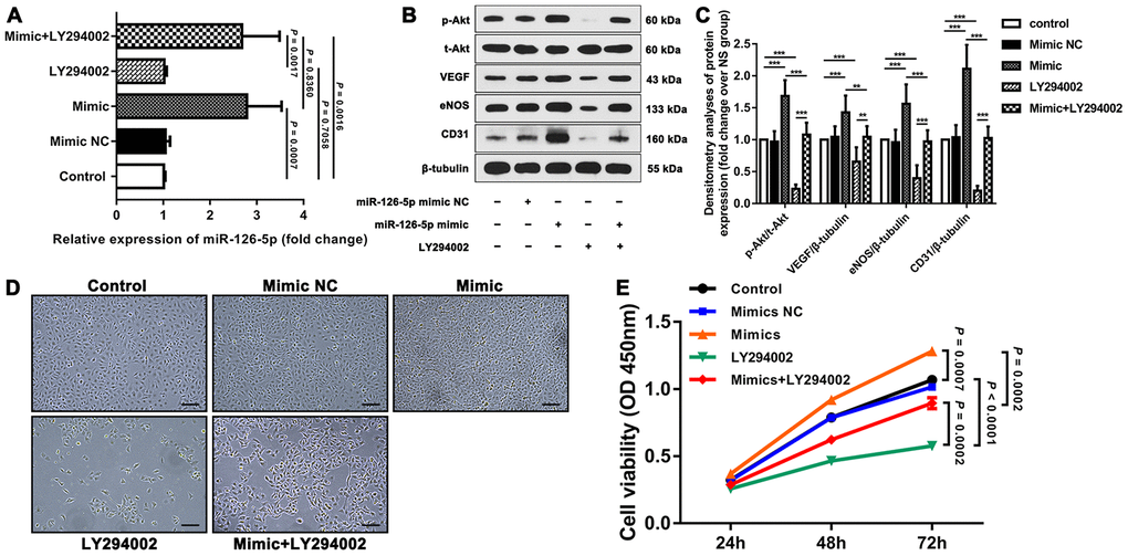 | Mimic+LY294002 | Transfected with 50 nM miRNA-126-5p mimic and treated with 10 μM LY294002 |