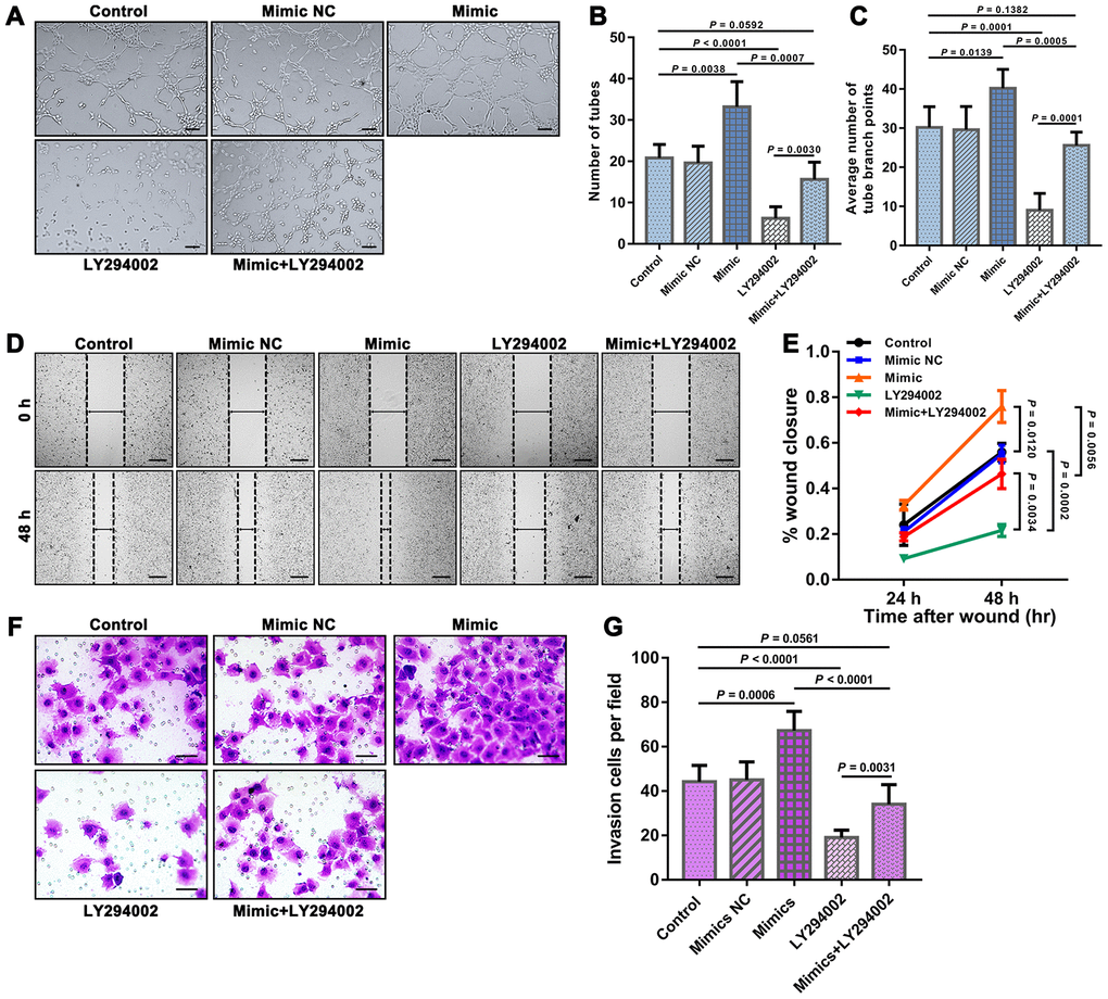 We further examined the tube formation and migration of HUVECs in the different groups through tube formation, Transwell migration and scratch wound assays. The results showed that the mimic group exhibited significantly improved HUVEC tube formation and migration than both the control group and the mimic+LY294002 group, and significantly worse HUVEC tube formation and migration were observed in the LY294002 group than in both the control group and the mimic+LY294002 group (Figure 3).