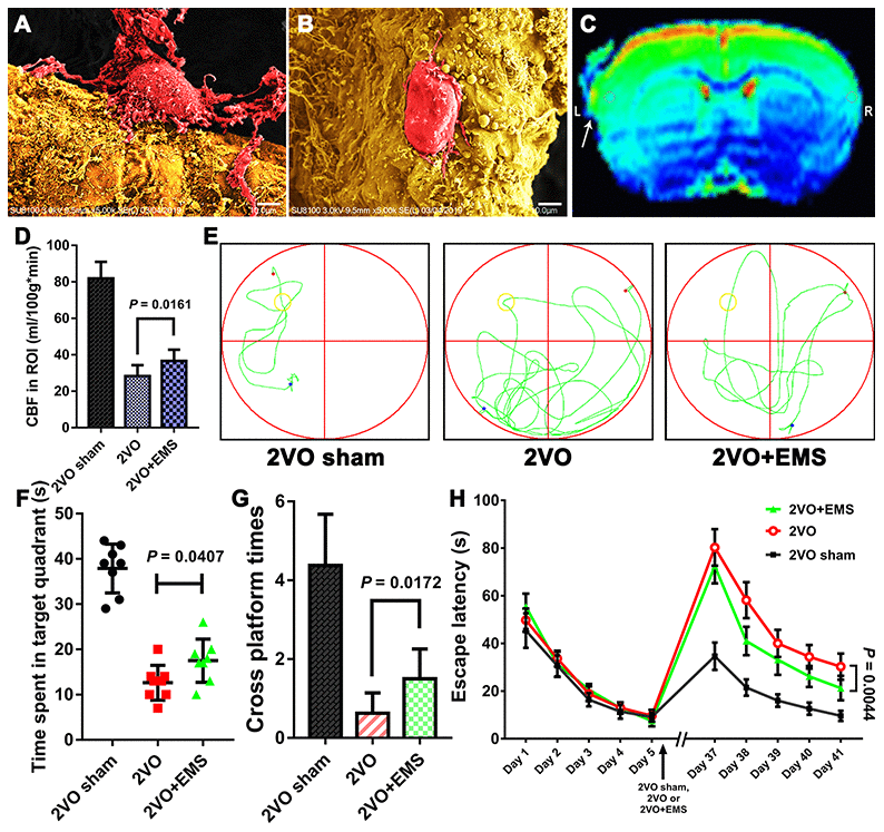 First, we observed that 34 days after EMS, the expression of vWF in TM on the EMS side was higher than that detected on the non-EMS side. We then compared the expression of VEGF in the brain tissues of 2VO+EMS rats (n = 8) between the EMS and non-EMS sides through immunofluorescence and western blot assays. The results showed that 34 days after EMS surgery, the expression of VEGF in the ischemic brain on the EMS side was significantly higher than that observed on the non-EMS side (6.056 ± 0.632 vs. 2.797 ± 0.379, P < 0.0001) (Figure 4). A scanning electron microscopy (SEM) analysis showed that the pericytes (around the capillaries) in the brain cortex on the non-EMS side exhibited atrophy with poor activity and presented finger-like extensions that were sparse and shortened, whereas the pericytes on the EMS side displayed high viability with long, abundant finger-like extensions. In addition, the CBF value of the region of interest (ROI) on the EMS side was significantly higher than that observed on the non-EMS side (36.6 ± 6.2 vs. 29.3 ± 5.1 ml/100 g·min, P = 0.0208). The results from the Morris water maze (MWM) test showed that the time spent in the target quadrant by the rats in the 2VO+EMS group was significantly longer than that found for the 2VO group (12.63 ± 3.85 s vs. 17.50 ± 4.74 s, P = 0.0407). In addition, the rats in the 2VO+EMS group crossed the platform significantly more often than the rats in the 2VO group (1.50 ± 0.76 vs. 0.63 ± 0.52, P = 0.0172), and the escape latency of the 2VO+EMS group was significantly shorter than that of the 2VO group (28.88 ± 5.64 vs. 30.38 ± 5.66, P = 0.0044) (Figure 5).