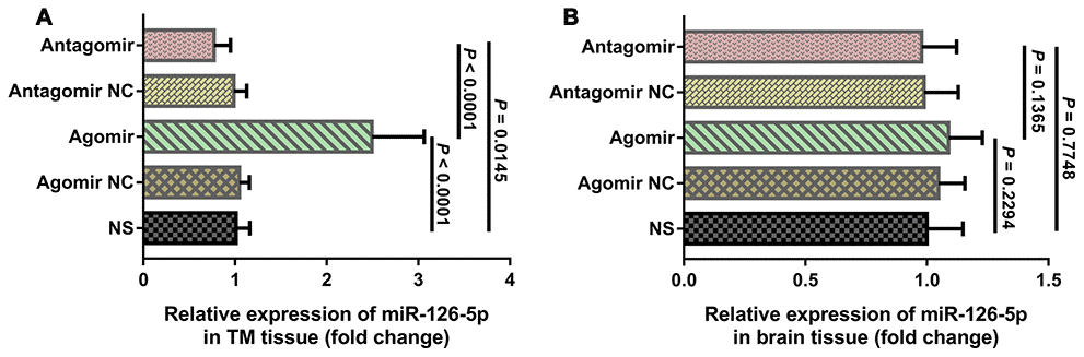 We used quantitative real-time polymerase chain reaction (qRT-PCR) to compare the expression of miR-126-5p in the TM and adjacent brain tissue from each group. The results showed that the expression of miR-126-5p in TM tissues from the agomir group was significantly higher than that detected in the tissues from the normal saline (NS) group (2.459 ± 0.567 vs. 1.013 ± 0.148, P < 0.0001), whereas the expression of miR-126-5p in TM tissues from the antagomir group was significantly lower than that detected in tissues from the NS group (0.773 ± 0.177 vs. 1.013 ± 0.148, P = 0.0145) (Figure 6A). However, the expression of miR-126-5p in the adjacent brain tissue from the agomir group was not significantly different from that observed in the tissues from any of the other groups (Figure 6B).